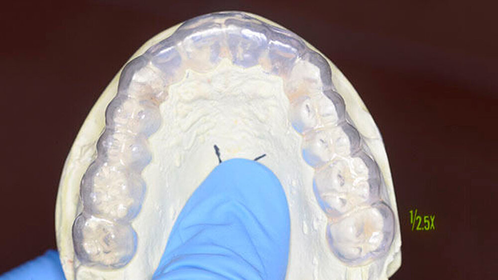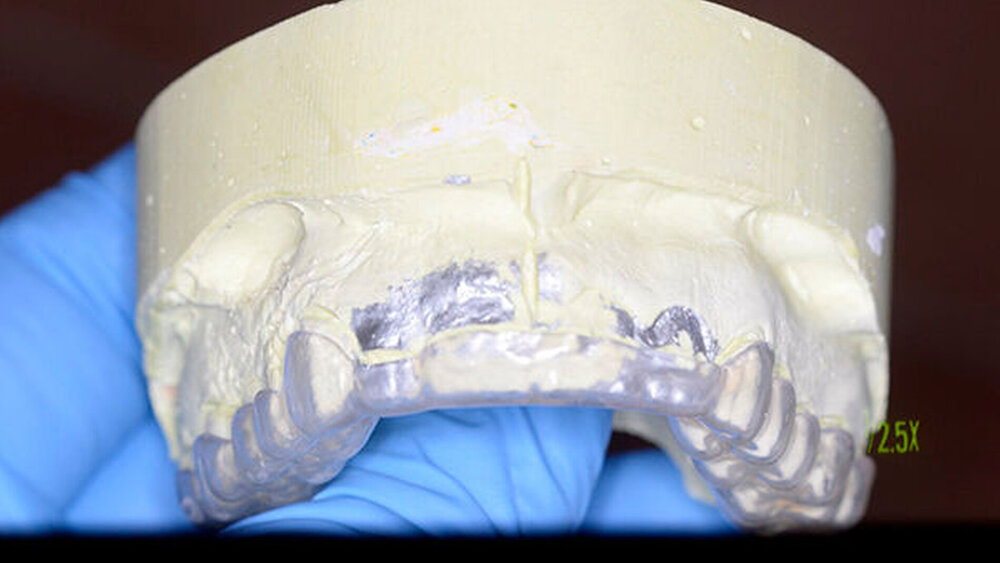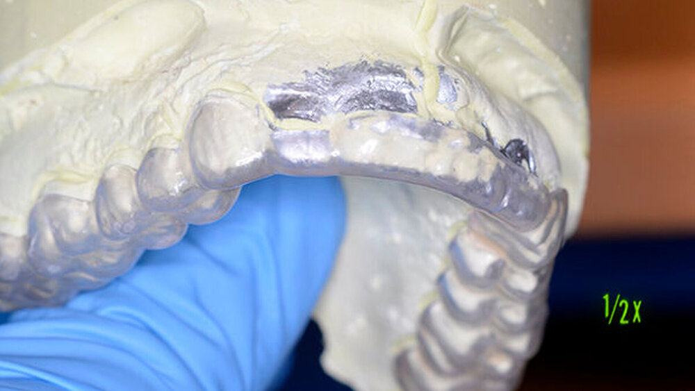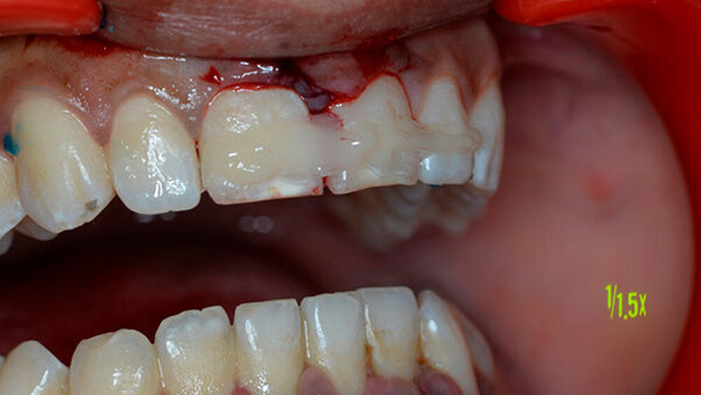 Der Zahn wurde zwei Stunden nach dem Unfall vital replantiert und semipermanent geschient. Die anschließende Abdrucknahme erfolgte unter allergrößter Sorgfalt. Die laborgefertigte Tiefziehschiene schließt die Bereiche der semipermanenten Schiene bis zum Schienenäquator mit ein. Was die Reanastomosierung der Gefäße und Nerven betrifft, ist der Behandler zuversichtlich, reagieren doch auch vital transplantierte Weisheitszähne nach einigen Wochen wieder auf Kältereize.