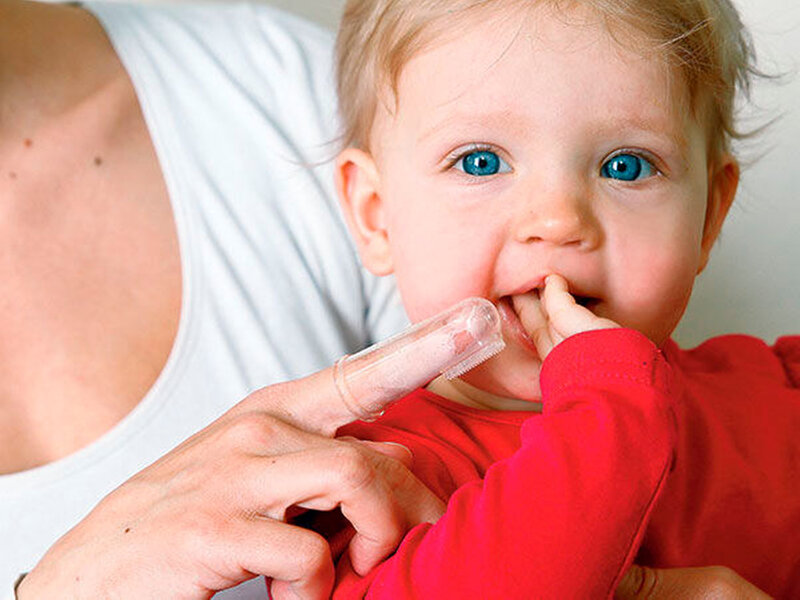 Noch bevor der erste Zahn im Kindermund erscheint, soll das Kind selbst mit einer Zahnbürste oder einem Beißring mit integriertem Zahnbürstenkopf spielen dürfen. Die Zahnbürste soll in den Mund, bevor der erste Zahn erscheint, denn dann ist das Spiel reine Lust, reines Vergnügen. Kommt zur Zahnbürste der Zahn hinzu, kommt der Zweck/die Funktion der Zahnbürste ins Spiel: Der rein zweckgebundene Einsatz einer Zahnbürste kann beim Kind Abwehr erzeugen. Der spielerische Einsatz der Zahnbürste vor dem ersten Zahn verringert die Abwehrhaltung eines Kindes entscheidend. Aus diesem Grund machen Eltern gute Erfahrungen mit ihrem Kind, wenn sie zum Fühlen und zur Massage des Kieferkamms einen Fingerling genommen haben und diesen dann fürs Erste-Zähne-sauber-putzen verwenden. Das Kind ist an den Fingerling gewöhnt, bevor der erste Zahn erscheint. Jetzt kommt auf den Fingerling nur noch eine Reiskorngröße fluoridhaltiger Kinderzahnpasta und in fünf bis zehn Sekunden sind die ersten Stückchen Zahn plaquefrei „geputzt”.
