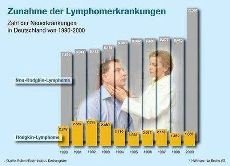 Während die Rate an Hodgkin-Lymphomen seit Jahren stabil ist, nimmt das Non-Hodgkin- Lymphom an Häufigkeit zu. Derzeit erkranken jährlich rund zehn bis 15 von 100 000 Einwohnern und das mit weiter steigender Tendenz. Damit ist jährlich in Deutschland von rund 10 000 Neuerkrankungen auszugehen, wobei Männer geringfügig häufiger als Frauen betroffen sind. Die Erkrankung kann in jedem Alter auftreten, die Häufigkeit nimmt mit zunehmendem Lebensalter zu. Das Durchschnittsalter bei Krankheitsbeginn liegt bei knapp über 60 Jahren, unklar noch ist, warum diese Tumorform immer frequenter wird. Diskutiert werden auch bei den NHL Zusammenhänge mit Infektionen, einem geschwächten Immunsystem, mit der Exposition gegenüber spezifischen chemischen Substanzen, wie Herbiziden und Insektiziden, oder einer Strahlenexposition.