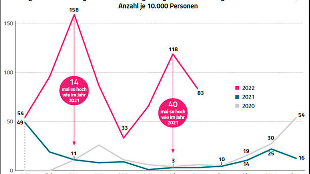 Im März gab es dem Bericht zufolge mit 158 Arbeitsunfähigkeits(AU)-Bescheinigungen je 10.000 Pflegefachkräfte im Pflegeheim die bisherige Spitze an AU-Bescheinigungen seit Beginn der Pandemie. Im Vergleich zu März 2021 waren es 14 Mal so viele Krankmeldungen (11 je 10.000). Im Juli dieses Jahres waren es sogar fast 40 Mal so viele wie im selben Zeitraum ein Jahr zuvor (118 und drei je 10.000). Aber auch Pflegebedürftige in Heimen waren demnach stark von den jeweiligen Corona-Wellen betroffen. Zu Beginn der Pandemie waren 50 bis 60 Prozent der mit COVID-Verstorbenen stationär Pflegebedürftige.