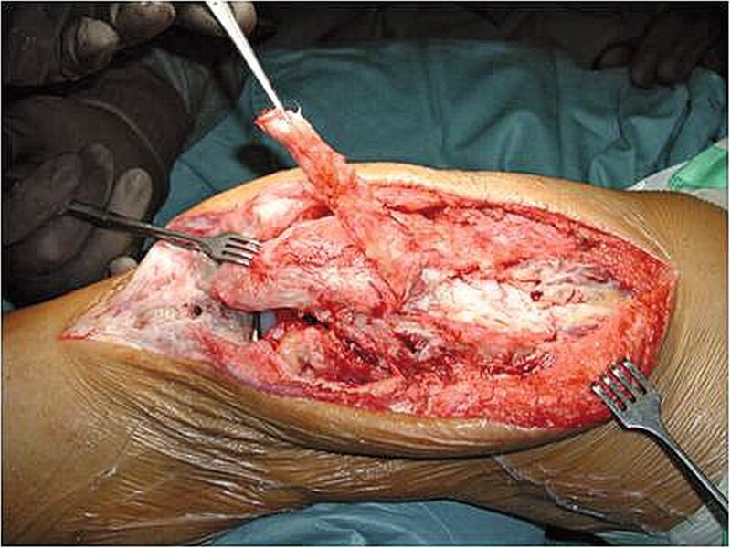 Partialrupturen ohne Kontinuitätsunterbrechung der Hauptportion der Quadrizepssehne oder der Patellarsehne können konservativ/funktionell mittels Orthesen behandelt werden. Es muss eine Teilbelastung für sechs Wochen eingehalten werden, maximale Beugung sollte vermieden werden. Bei höhergradigen Partial- oder kompletten Rupturen besteht die Indikation zur Operation. Welches Verfahren angewandt wird, hängt im Wesentlichen von der Ausbildung des Chirurgen ab [2, 5, 8]. Voraussetzung für die Sehnenheilung ist sowohl eine stabile Sehnennaht als auch eine frühfunktionelle Nachbehandlung. Wenige Tage nach dem Trauma beginnt sich die Sehne bereits zu retrahieren. Ein Zeitrahmen von drei bis 14 Tagen bis zur operativen Rekonstruktion wird noch als günstig angegeben. Doch auch Patienten mit älteren Rupturen profitieren aufgrund der schlechten Ergebnisse konservativer Therapie von rekonstruktiven Verfahren. Verzögerungen der operativen Versorgung über die Primärphase hinweg führen bei ausgeprägten kompletten Rupturen zu einer Retraktion der Sehne nach proximal, welche dann aufwendige rekonstruktive Maßnahmen erforderlich macht. Bei der Operation sollte regelhaft eine Gewebeprobe zur histologischen Untersuchung entnommen werden, um degenerative Schädigungen nachzuweisen. Liegt ein Sehnendefekt vor, oder lässt sich keine Readaptation des Sehnenstumpfes an die Patella erzielen, muss eine lokale Sehnenplastik erfolgen (Abbildung 5) [5]. Als Nahtmaterial sollten bevorzugt monofile, spät resorbierbare Fäden verwendet werden. Zur Augmentation kann ebenfalls Nahtmaterial (wie Fiberwire) Verwendung finden oder Drahtcerclagen. Letztere erfordern jedoch eine spätere Implantatentfernung [1, 4 bis 6].