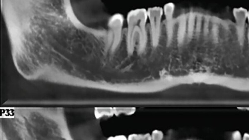 Eine 32-jährige Patientin stellte sich mit Parästhesien im linken Unterkieferbereich in einer oralchirurgischen Praxis in Foggia (Italien) vor. Sie berichtete, dass die Beschwerden seit fünf Tagen bestanden und sie vor drei Jahren eine radikale Bimastektomie wegen eines invasiven lobulären Mammakarzinoms hatte. Sie erhielt Chemotherapie und Bestrahlung sowie eine Dauertherapie mit 4 mg Zoledronsäure intravenös alle drei Wochen. Intraorale zeigte sich eine gute Mundhygiene, keine Schwellungen, Fisteln oder offene Schleimhaut. Auffällig waren allerdings regionale Lymphknotenschwellungen submandibulär sowie eine von extraoral tastbare, leichte Schwellung im Bereich des Kieferwinkels linksseitig. Es wurden ein PET-CT sowie ein DVT angefertigt.