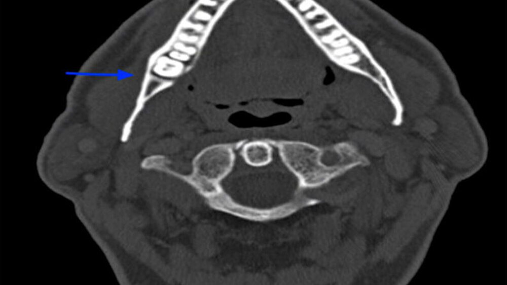 Anhand der klinischen Beurteilung wurde die Verdachtsdiagnose eines Plattenepithelkarzinoms gestellt. Differenzialdiagnostisch kam eine Epulis in Betracht. Zur Beurteilung der Befundausdehnung sowie zur Planung der weiteren Therapie wurde ein CT des Halses mit Kontrastmittel im Rahmen des Stagings durchgeführt. Im CT konnte das Ausmaß der Osteolysen ermittelt werden. Zu dem Zeitpunkt hatte keine Arrosion der Kortikalis stattgefunden (Abbildung 3). Darüber hinaus zeigten sich zahlreiche prominente und insbesondere rechtsseitig vergrößerte zervikale Lymphknoten, welche als metastasenverdächtig eingestuft wurden (Abbildung 4). Aufgrund der unklaren Dignität des Befundes erfolgte zur histologischen Diagnosesicherung die ambulante Probeentnahme in regio 048.