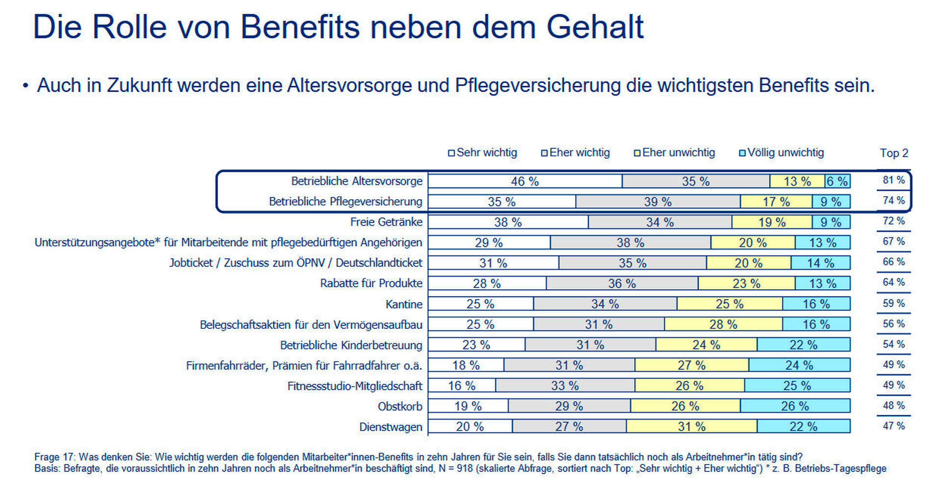 Unterstützungsprogramme für Mitarbeitende mit pflegebedürftigen Angehörigen und betriebliches Gesundheitsmanagement finden Beschäftigte ebenfalls wichtig , gefolgt von Rabatten für Produkte, einer Kantine und Belegschaftsaktien für den Vermögensaufbau. Auch Bahntickets und eine betriebliche Kinderbetreuung stoßen auf großes Interesse. Der besagte Obstkorb, ein Dienstwagen, Firmenfahrräder und eine Fitnessstudio-Mitgliedschaft kommen bei den Jüngeren gut an, über alle Befragten hinweg stehen sind aber am Ende des Rankings.