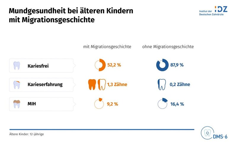 Im Hinblick auf die Zahnputzhäufigkeit zeigte sich insbesondere bei den älteren Kindern ein höherer Anteil mit Migrationsgeschichte im Vergleich zu ohne Migrationsgeschichte, die sich seltener als zweimal täglich die Zähne putzen (29 versus 11 Prozent). Ältere Kinder und jüngere Erwachsene mit Migrationsgeschichte hatten mehr kariöse Zähne als Gleichaltrige ohne Migrationsgeschichte (Kinder: 0,4 Zähne versus 0,1 Zähne und Erwachsene: 0,8 Zähne versus 0,3 Zähne) und einen niedrigeren Karies-Sanierungsgrad (68 versus 77 Prozent beziehungsweise 87 versus 96 Prozent).