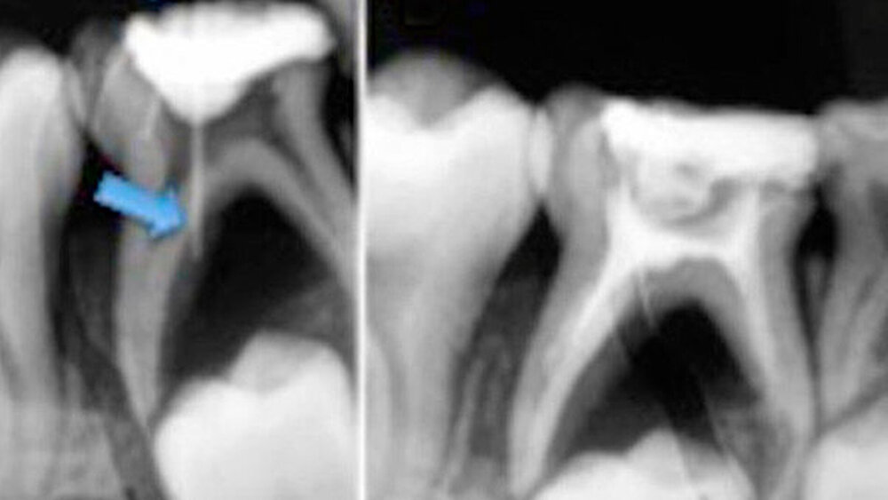 Es wurde eine nicht-vitale Pulpektomie durchgeführt: Ein geradliniger Zugangshohlraum wurde hergestellt und die Kanäle wurden behandelt. Nach koronaler Aufweitung jedes Kanals wurden die Wurzelkanäle gereinigt und geformt, gefolgt von einer ausgiebigen Spülung mit normaler Kochsalzlösung und 1 Prozent Natriumhypochlorit (NaOCl). Die Kanäle wurden getrocknet, gefolgt vom Aufbringen eines Calciumhydroxid (Ca(OH)2)-Verbands. Die Abdichtung des Zugangshohlraums erfolgte mit Zinkoxid-Eugenol-Zement.