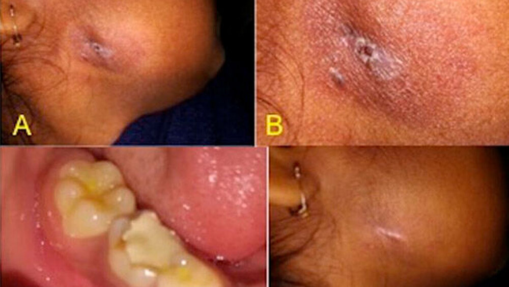 Ein siebenjähriges Mädchen wurde an der Conservative Dentistry and Endodontics Department of Bangabandhu Sheikh Mujib Medical University (BSMMU) vorstellig. Sie klagte über seit einem Jahr andauernde Beschwerden mit einer nicht heilenden kutanen Wunde der an der unteren rechten Wange. Bei der Anamnese gab sie multiple systemische Antibiotika-Therapien zusammen mit einer Ausschabung des extraoralen Sinustrakts an. Es zeigten sich keine weitere Auffälligkeiten in ihrer Krankengeschichte.