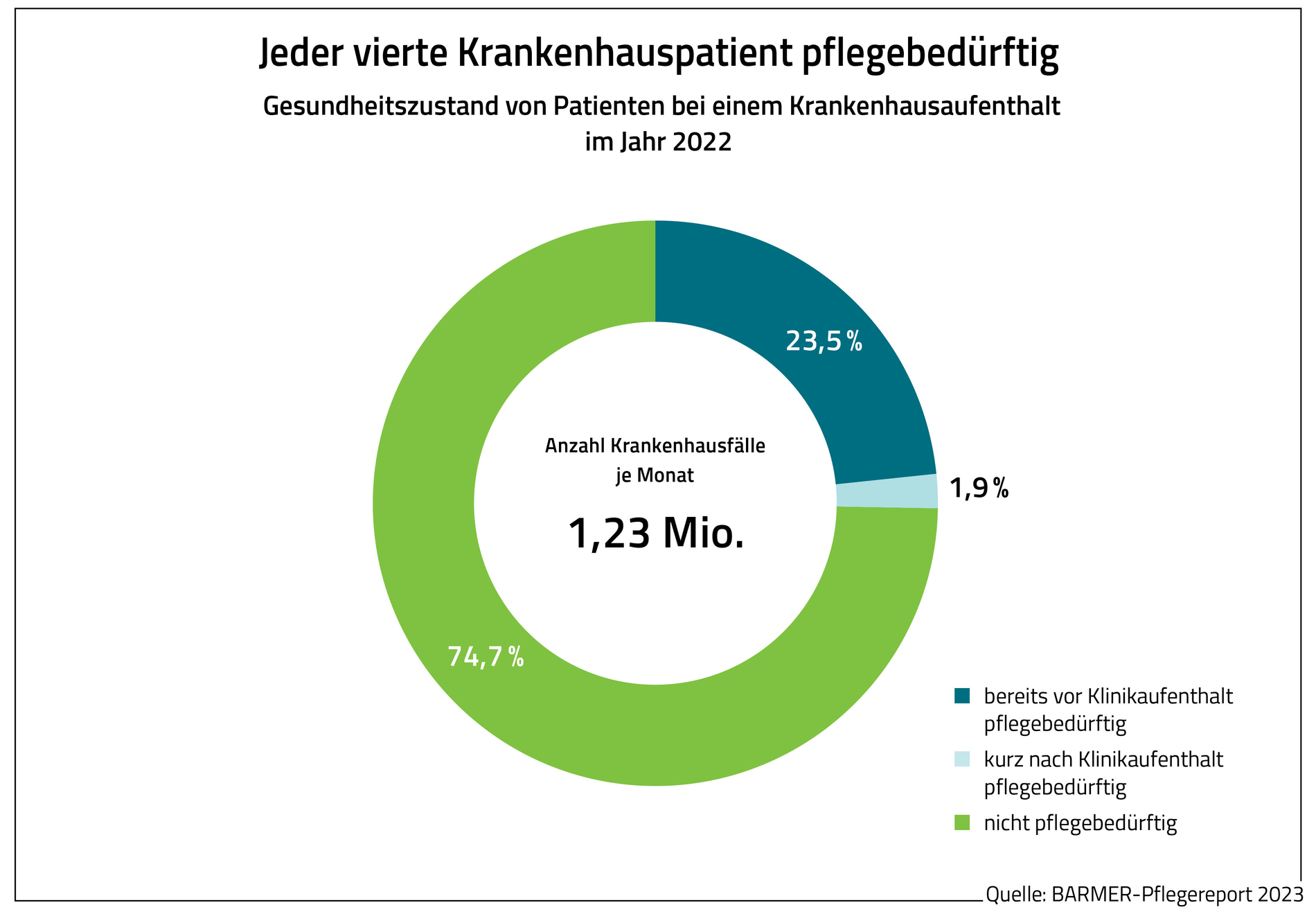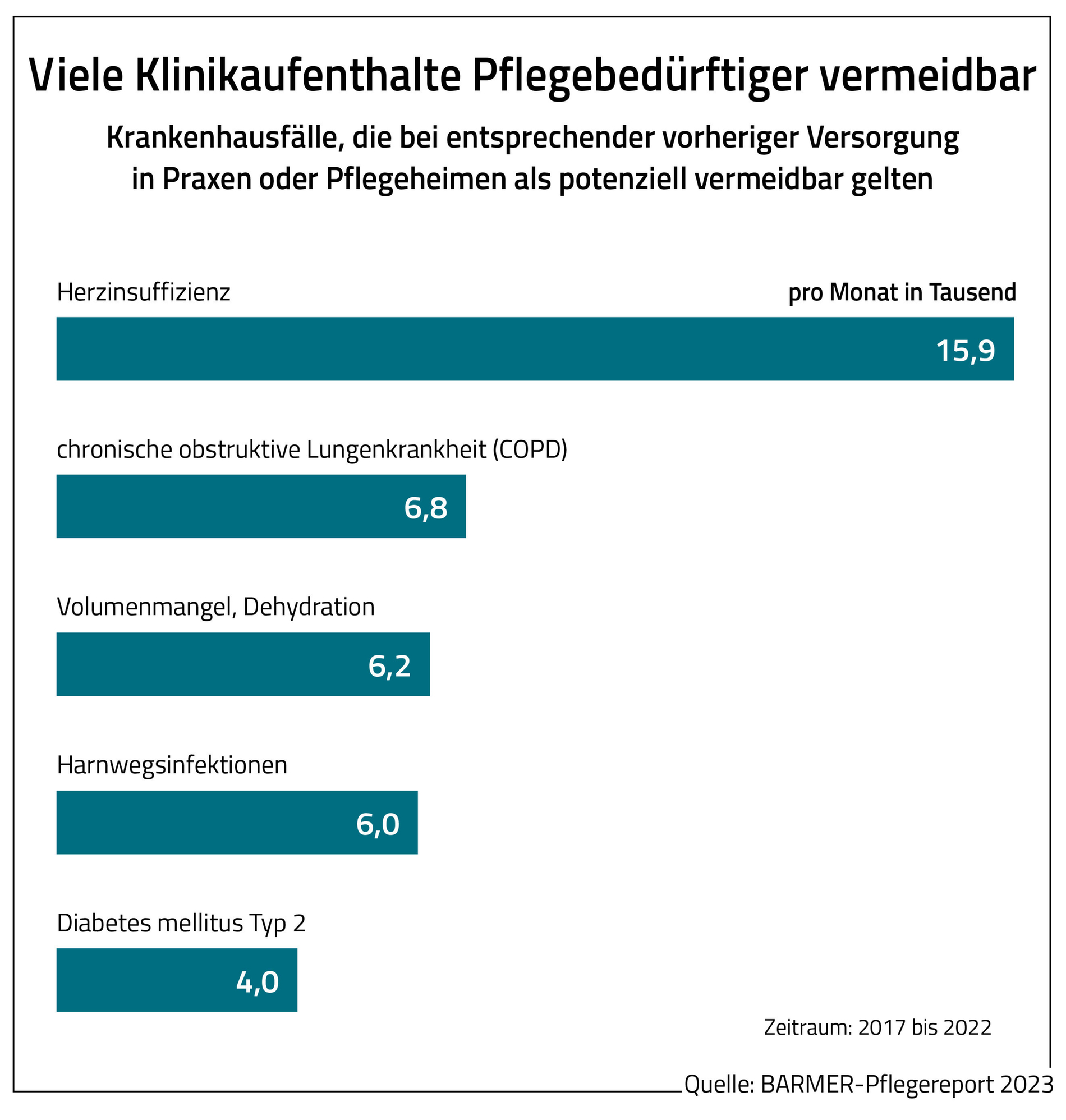 Wie aus dem Pflegereport hervorgeht, waren zwischen 2017 und 2022 monatlich im Schnitt rund 280.000 pflegebedürftige und kurz vor der Pflegebedürftigkeit stehende Patienten in einer Krankenhausbehandlung. Dabei habe es sich häufig um ambulant-sensitive oder Pflegeheim-sensitive Fälle gehandelt, die unter besseren medizinischen Bedingungen von der Hausarztpraxis oder im Pflegeheim behandelt werden könnten. Als Beispiele werden Herzinsuffizienz mit monatlich rund 15.900 Krankenhausfällen und Diabetes mellitus Typ 2 mit etwa 4.000 Fällen aufgeführt. Bei einer gezielteren Versorgung im Vorfeld müssten Pflegebedürftige mit entsprechenden Erkrankungen meist gar nicht erst in ein Krankenhaus.