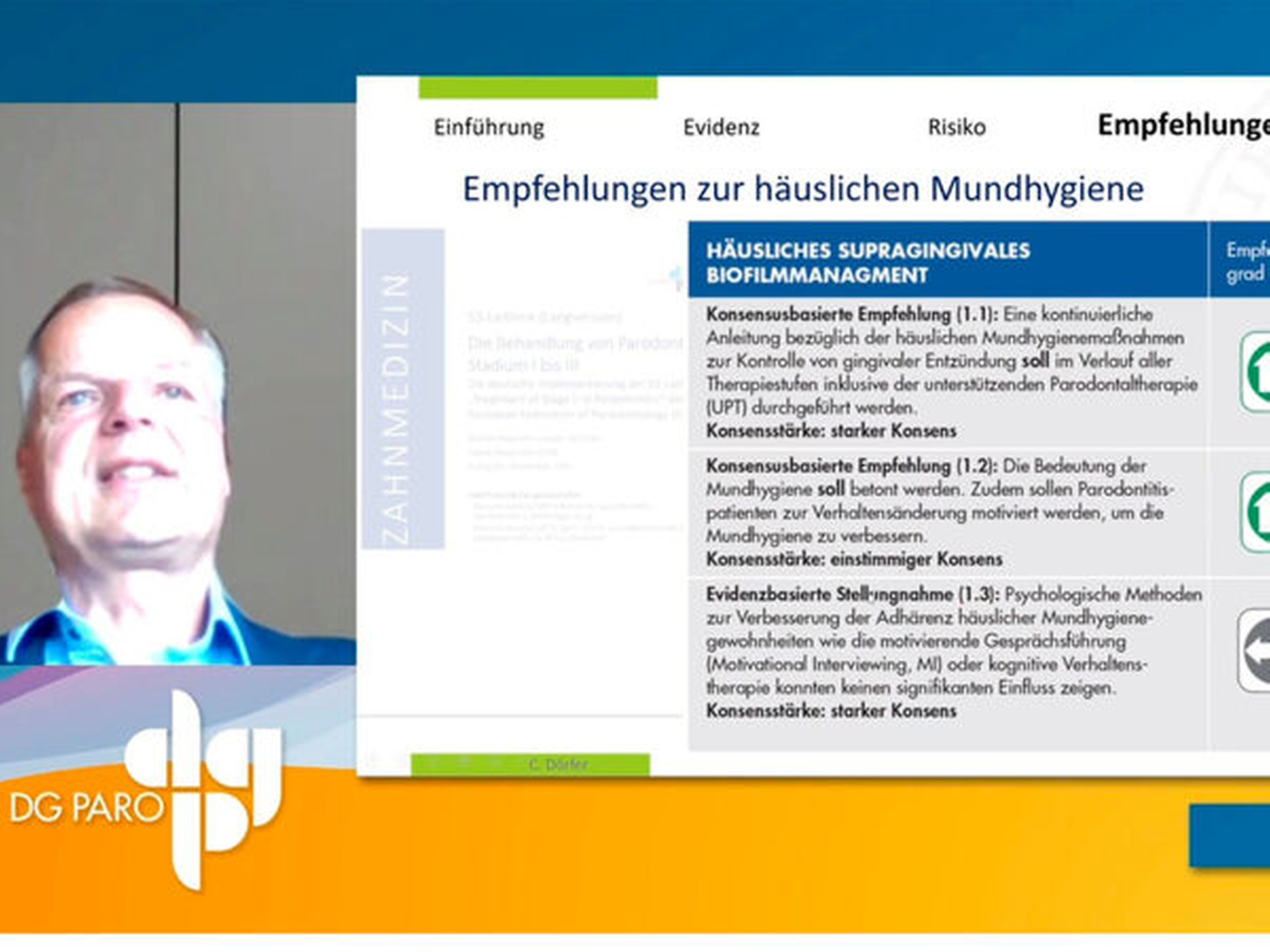 Basierend auf den Empfehlungen der S3 Leitlinie fasst er zusammen, dass Interdentalreinigungen einen zusätzlichen Nutzen bringen, wobei neben der Zahnbürste die Interdentalraumbürste das Hilfsmittel der ersten Wahl sei. Implantate sollten bei der häuslichen Reinigung wie Zähne behandelt werden. Bei Zeichen von Traumatisierungen läge nicht grundsätzlich eine Kontraindikation zur Verwendung von Hilfsmitteln vor.