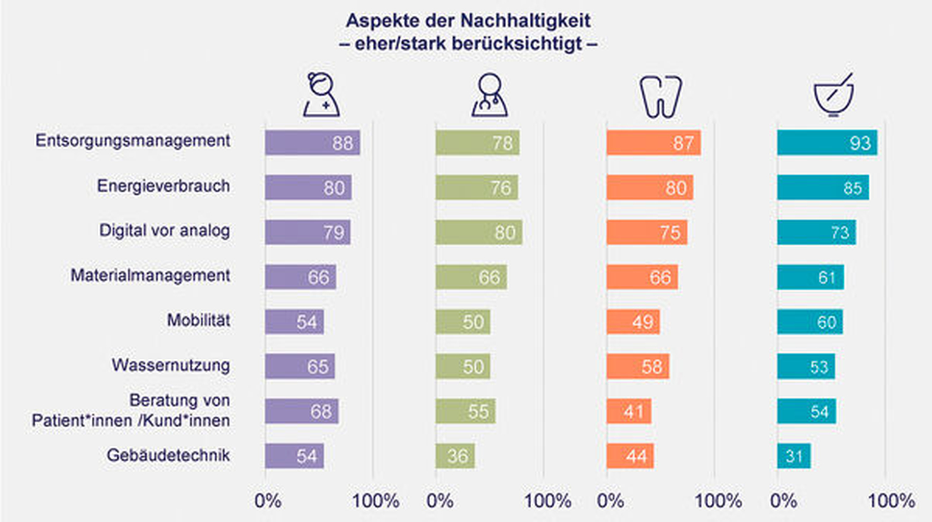 Fast alle abgefragten ökologischen Maßnahmen werden von mindestens der Hälfte der Niedergelassenen bereits berücksichtigt – allem voran das Entsorgungsmanagement, wie Mülltrennung, Recycling und die Nutzung von Mehrwegprodukten. Dicht gefolgt von einem ressourcenschonenden Energieverbrauch, sei es durch Ökostrom oder durch energieeffiziente Geräte, und der Digitalisierung im Sinne einer papierlosen Praxis oder Apotheke. Die Mehrheit handelt vor allem aus persönlicher Überzeugung und weil sie sich gesellschaftlich verantwortlich fühlt. Aber klar: Auch die Senkung der Betriebskosten spielt eine Rolle.