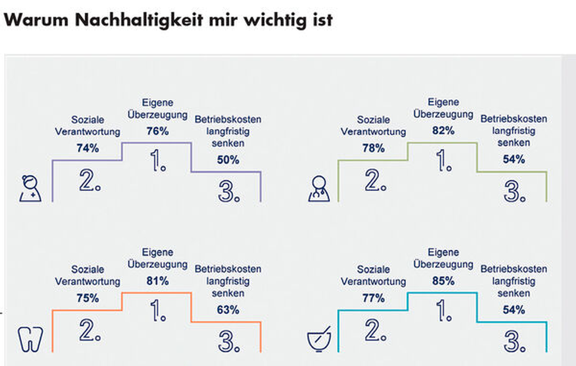 Für 61 Prozent der befragten Heilberufler hat Nachhaltigkeit einen hohen, für 28 Prozent sogar einen sehr hohen Stellenwert. Auf einer Skala von 1 (nicht nachhaltig) bis 10 (sehr nachhaltig) bewerten sie ihre Praxen und Apotheken durchschnittlich mit 6,2. Die größten Treiber für mehr Nachhaltigkeit sind für sie die eigene Überzeugung und die soziale Verantwortung gegenüber der nachfolgenden Generation.