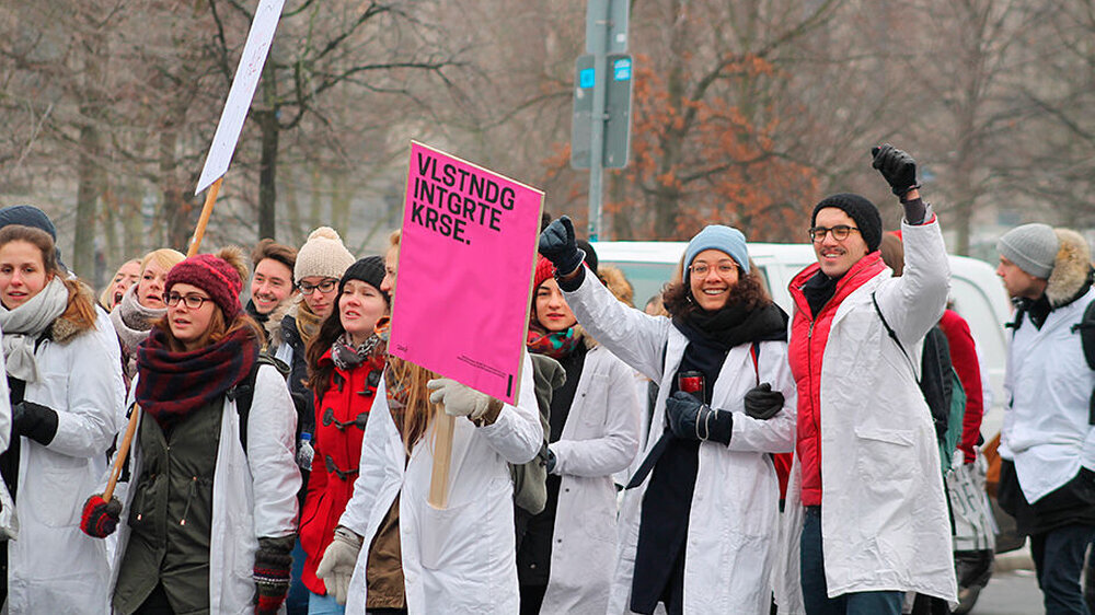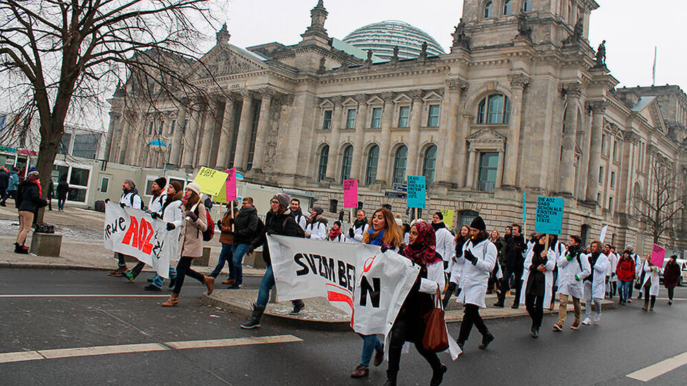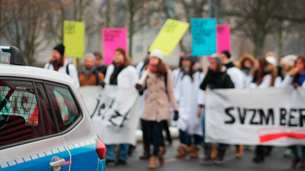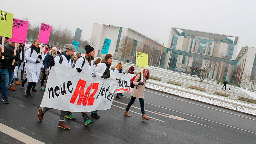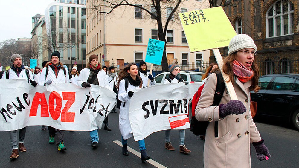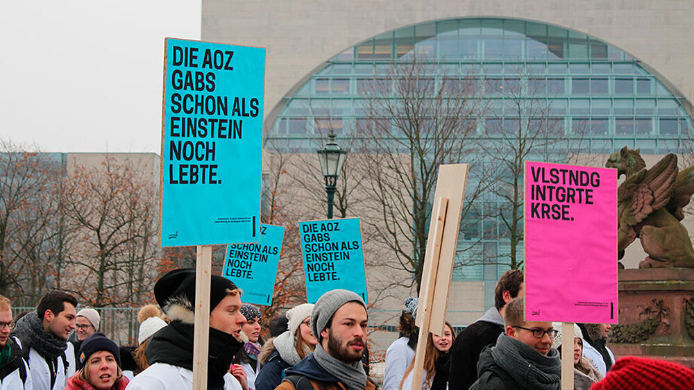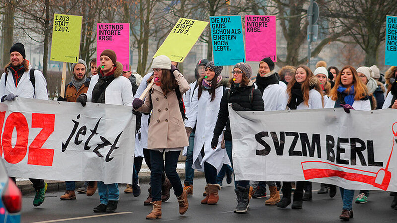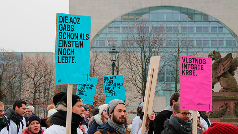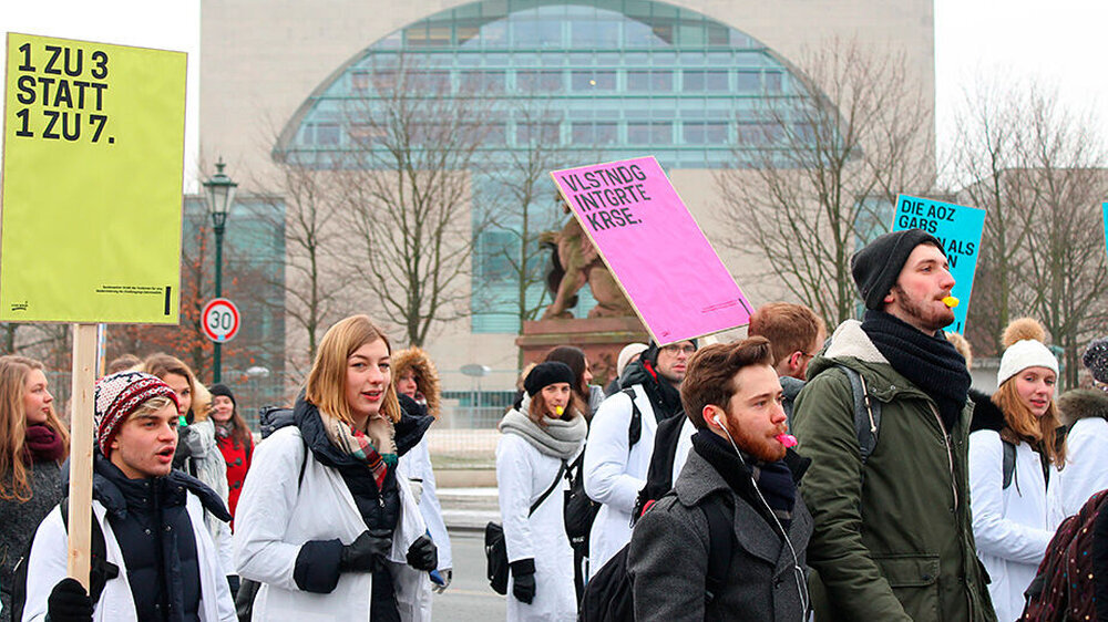 "Neue AOZ - jetzt!" Etwa 80 Zahnmedizinstudierende der Charité zogen heute durch das Berliner Regierungsviertel und demonstrierten gegen die vom Bundesgesundheitsministerium (BMG) angekündigte Verzögerung bei der Umsetzung der neuen AOZ.