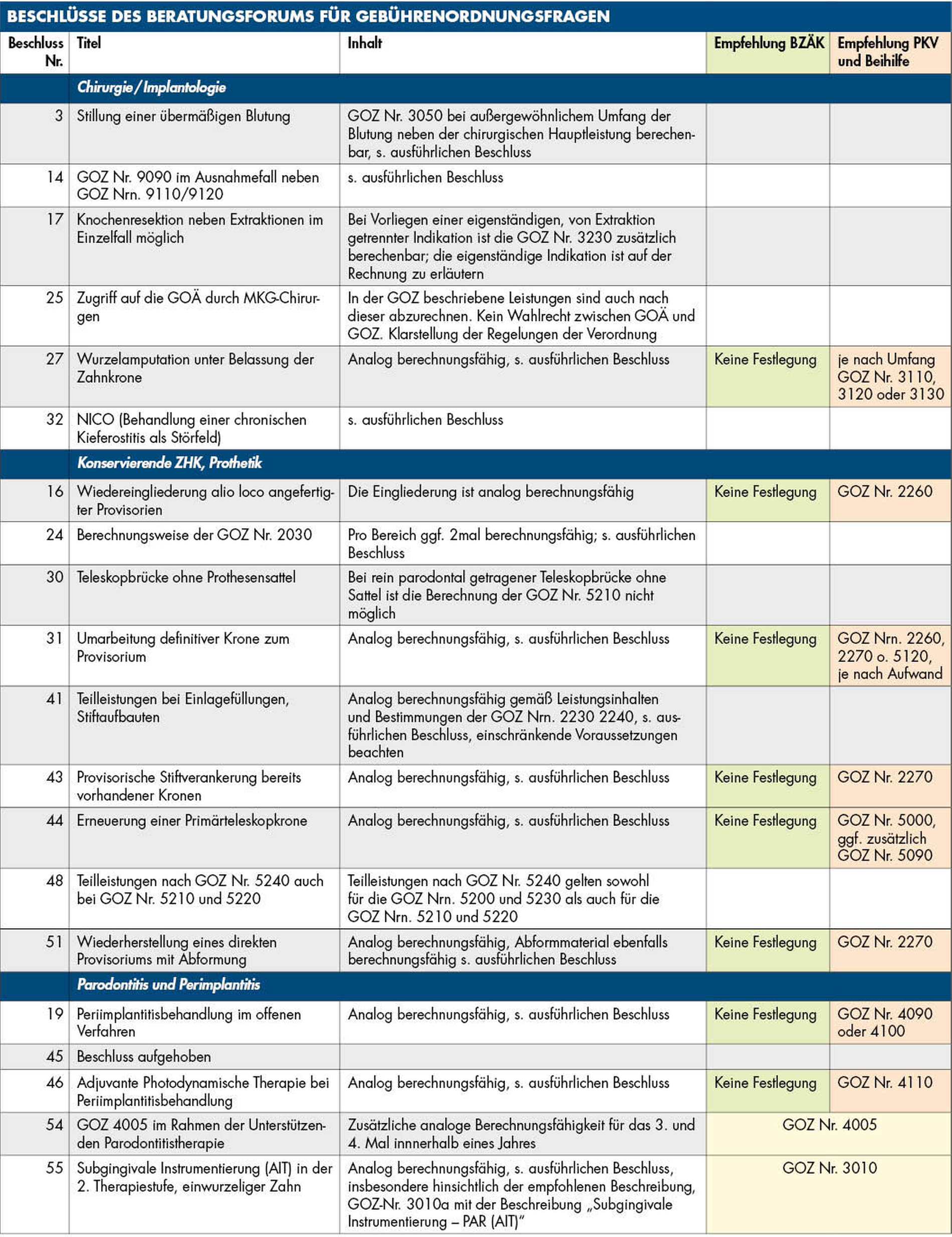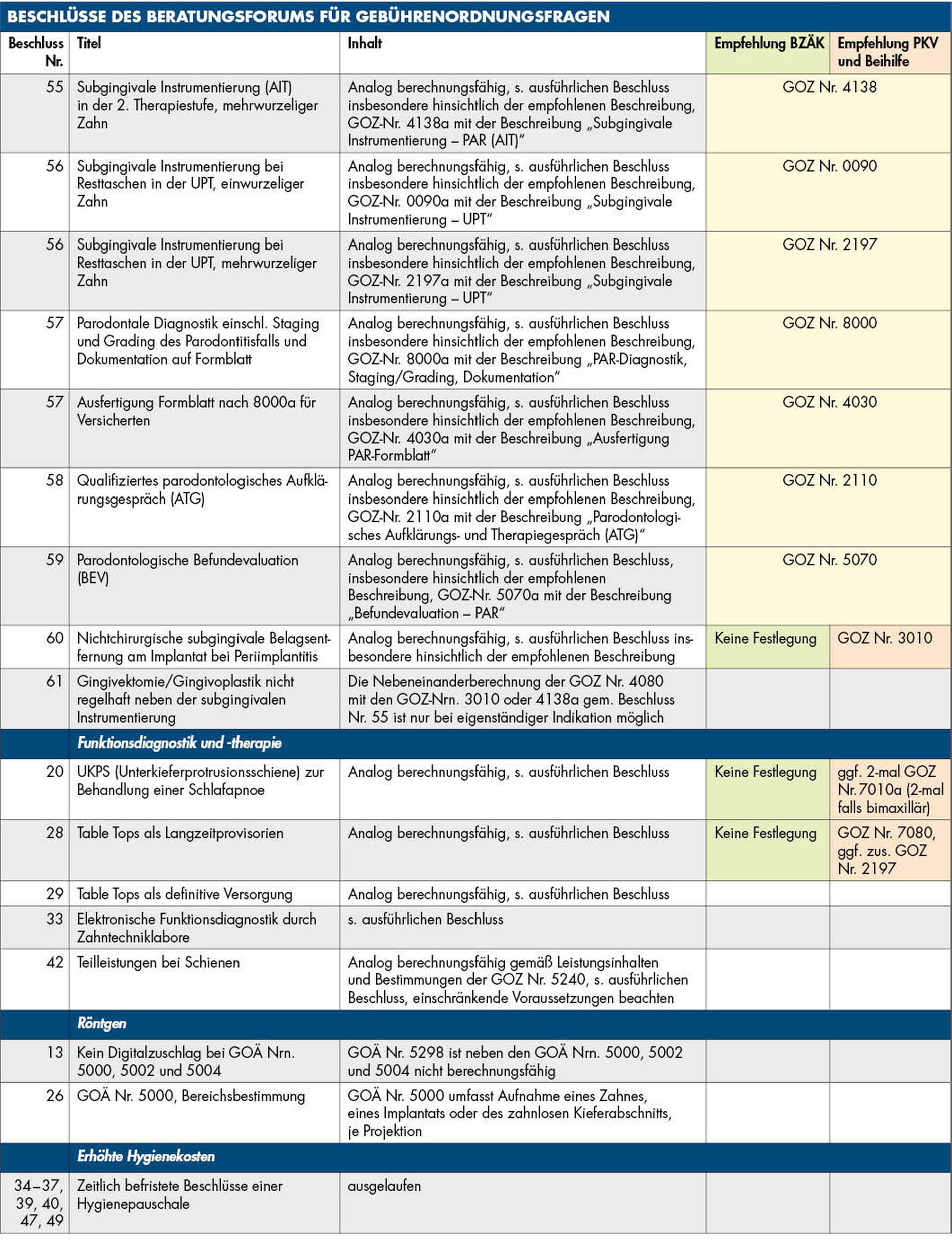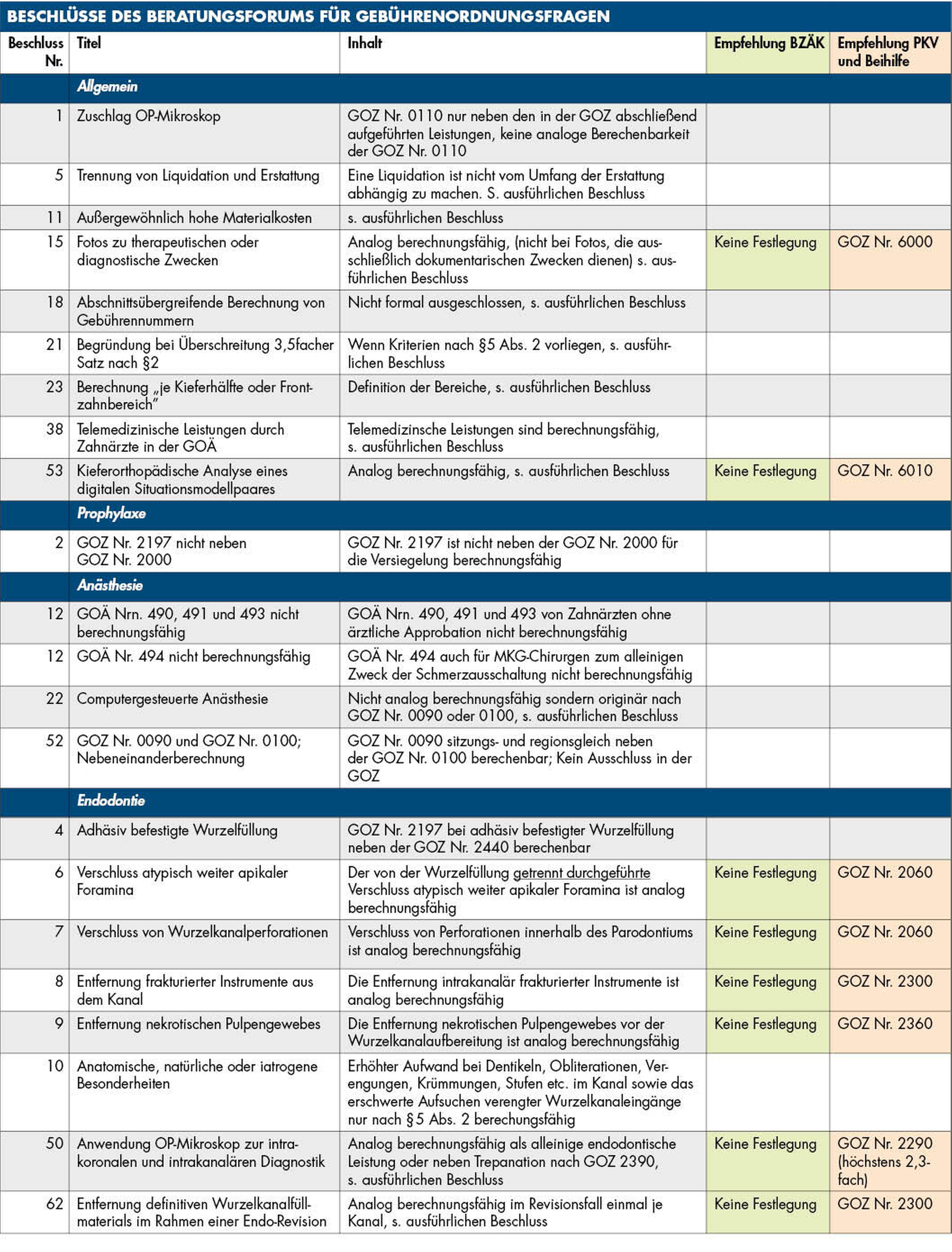 Eine vollständige Zusammenstellung der Beschlüsse des Beratungsforums – in chronologischer Reihenfolge wie auch geordnet nach Themenkomplexen – finden Sie unter anderem auf der Homepage der Bundeszahnärztekammer unter: www.bzaek.de/fileadmin/PDFs/goz/a/beschluesse_beratungsforum.pdf
