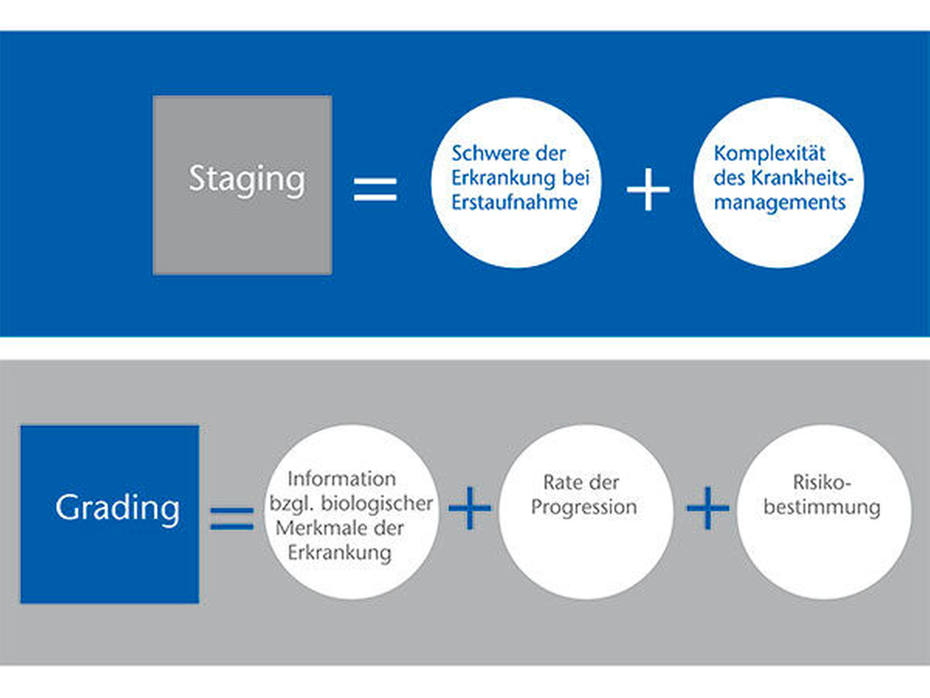 Das „Stadium“ bezieht sich auf die Schwere der Erkrankung bei der Erstvorstellung und die Komplexität der Therapie, während der „Grad “ zusätzliche Informationen über die biologischen Merkmale der Erkrankung liefert.