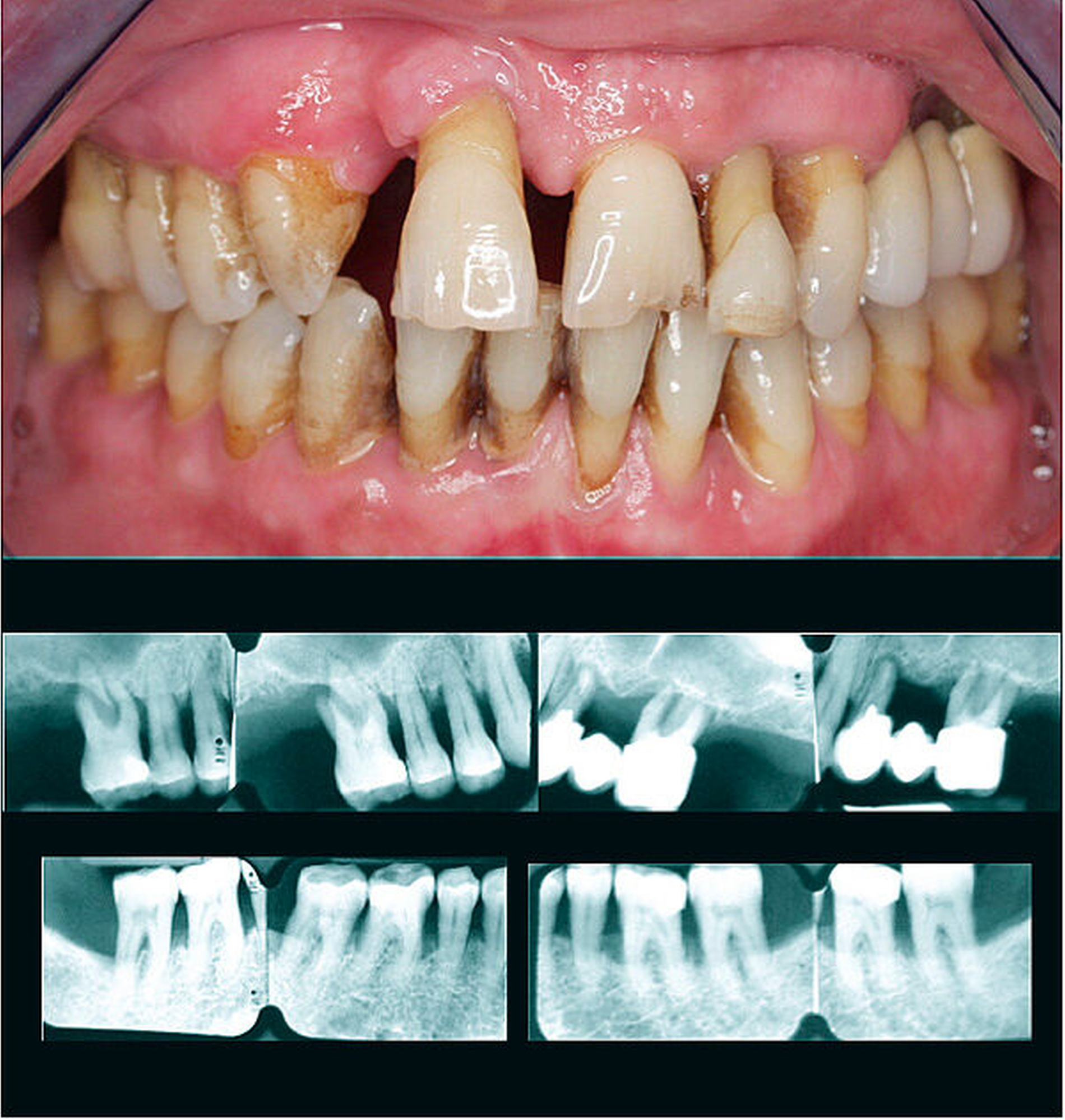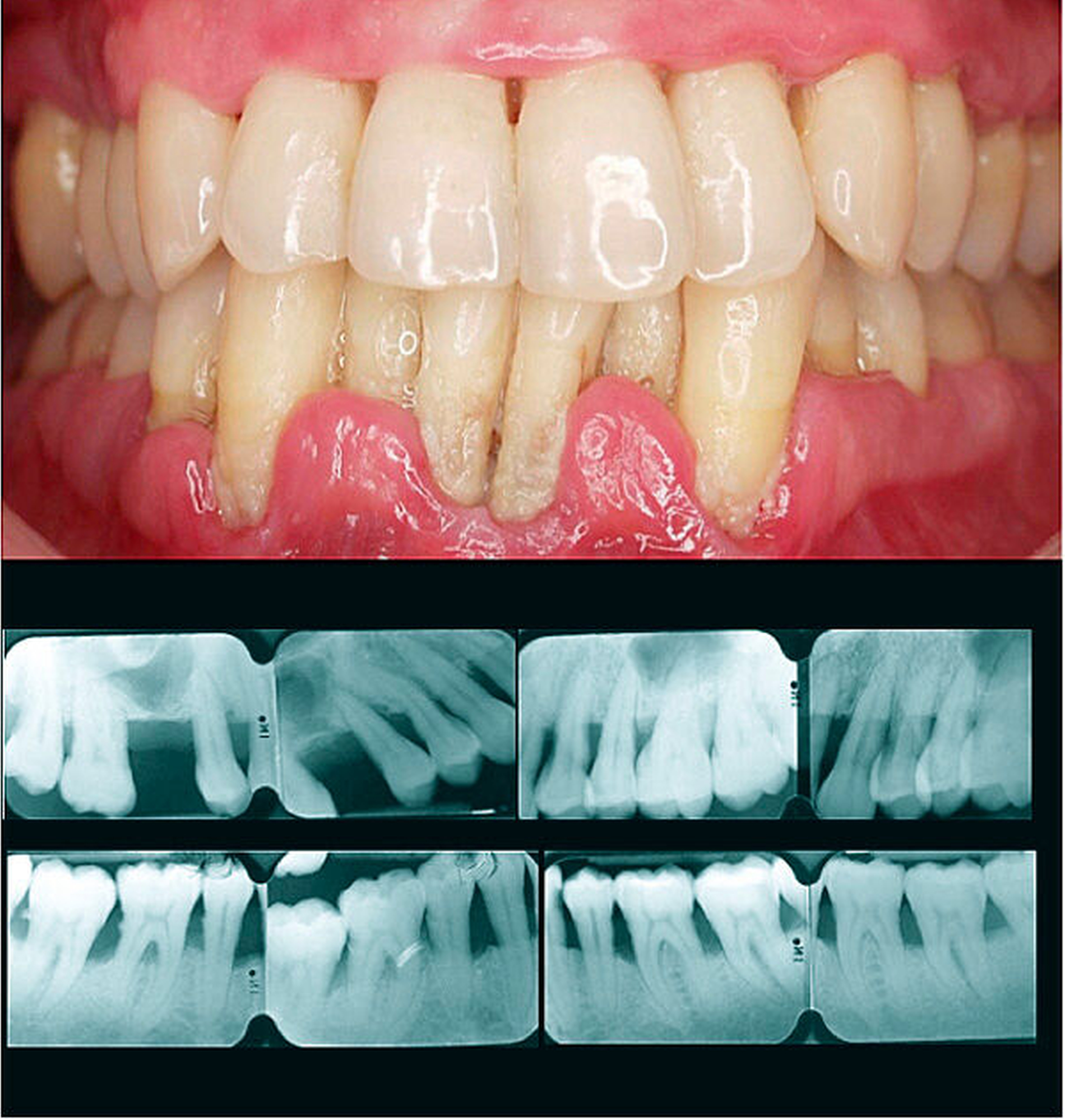 Wenn das Vorhandensein von interdentalem CAL bei der oralen Untersuchung des Patienten einen Verdacht für einen Fall von Parodontitis ergibt, müssen wir abklären, ob dieser CAL nur durch lokale Faktoren verursacht wird – Endo-Paro-Läsionen, vertikale Wurzelfrakturen, Karies, Restaurationen oder impaktierte dritte Molaren. Wenn nicht, dann müssen wir abklären, ob der interdentale CAL in mehr als einem nicht-benachbarten Zahn vorhanden ist. Wenn dies der Fall ist, handelt es sich um einen Parodontitis-Patienten und wir müssen eine umfassende parodontale Diagnose durch Erhebung eines Parodontalstatus und eines Röntgenstatus stellen. Wenn der Parodontalstatus keine PPD von 4 mm oder mehr anzeigt, müssen wir den Gesamt-BOP bewerten. Wenn der BOP mindestens 10 Prozent ist, lautet die Diagnose „gingivale Entzündung bei einem Parodontitis-Patienten“; wenn sie niedriger als 10 Prozent ist, lautet die Diagnose „Patient mit einem reduzierten, aber gesunden Parodontium“. Wenn der Parodontalstatus PPD von 4 mm oder mehr zeigt, lautet die Diagnose ein Fall von „Parodontitis“, der nach Stadium und Grad beurteilt werden muss.
