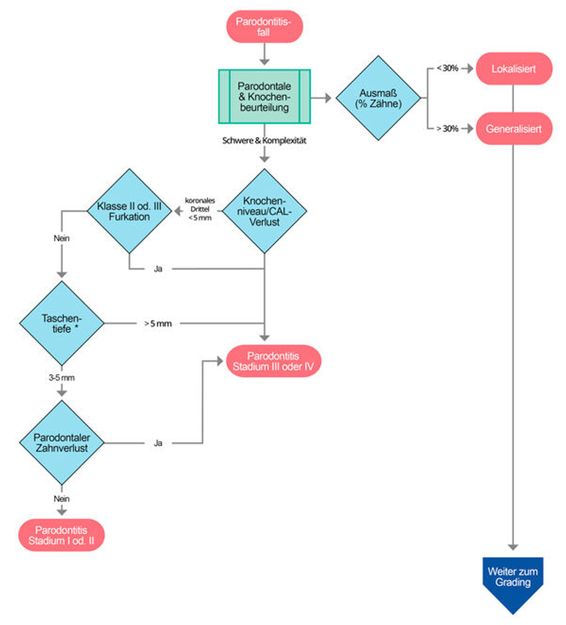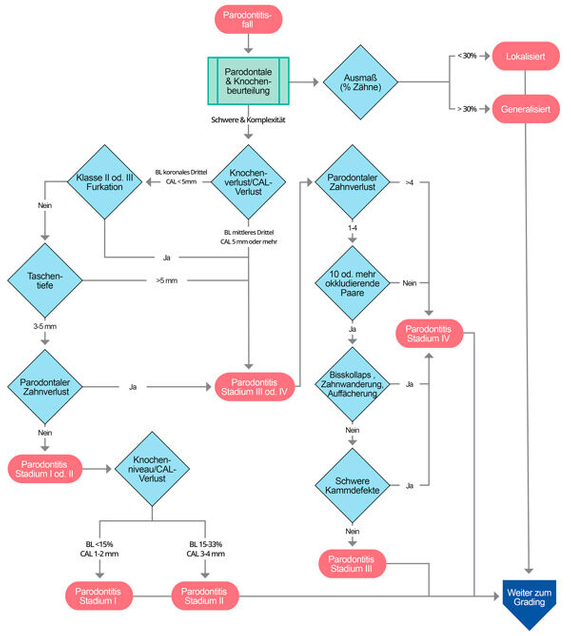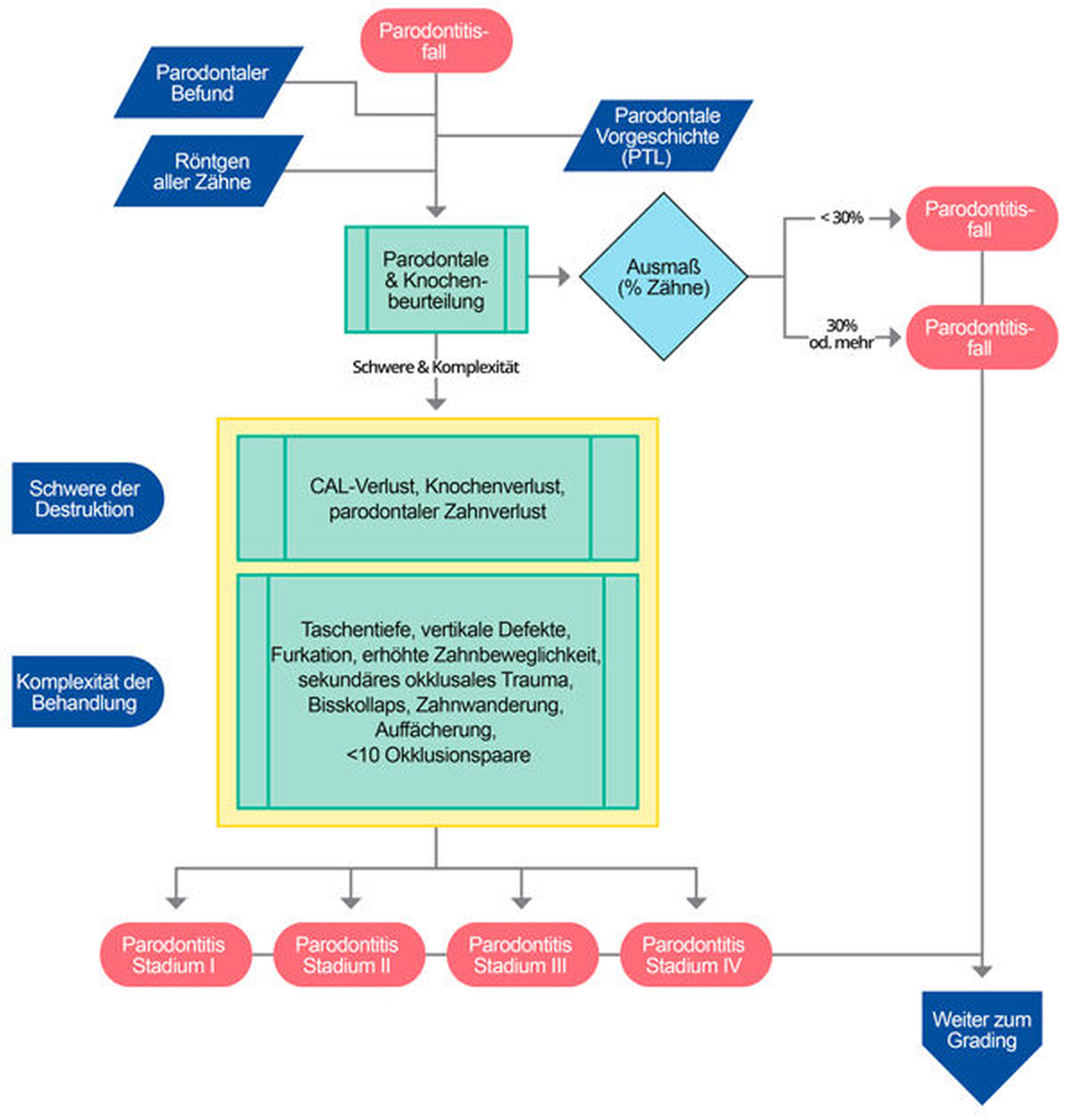 Der individuelle Fall einer Parodontitis sollte durch eine einfache Matrix aus vier Schritten (siehe unten: Klinischer Entscheidungsbaum für Staging und Grading), die Stadium und Grad der Erkrankung beschreibt, weiter charakterisiert werden. Es gibt vier Stadien und drei Grade.