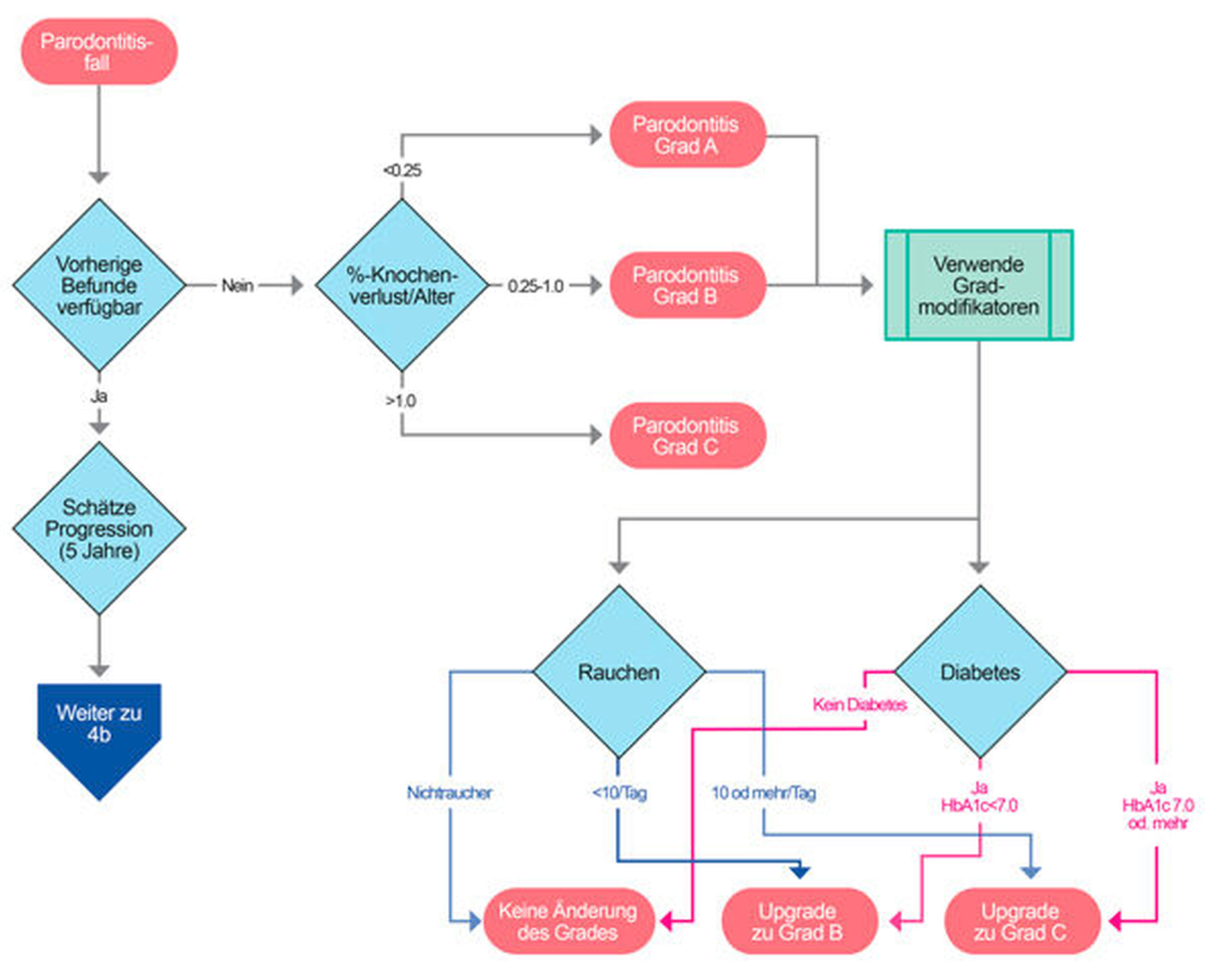 Wenn parodontale Aufzeichnungen des Patienten verfügbar sind, sollte die Progressionsrate der Parodontitis über die zurückliegenden fünf Jahre berechnet werden. Wenn die Progression weniger als 2 mm beträgt, ist die Diagnose Parodontitis Grad B. Wenn es in fünf Jahren keine Progression gegeben hat, ist die Diagnose Parodontitis Grad A. Wenn die Progression 2 mm oder mehr betrug, ist die Diagnose Parodontitis Grad C. Grad A und Grad B können höhergestuft werden, wenn der Patient raucht oder Diabetiker ist. Die Diagnose eines Patienten, der zehn Zigaretten oder mehr pro Tag raucht, wird in Grad C umgewandelt, während ein Grad-A-Patient, der weniger als zehn Zigaretten raucht, auf Grad B hochgestuft wird. Ebenso wird ein Diabetes-Patient mit einem HbA1c-Wert unter 7,0 auf Grad B und einer mit einem HbA1c-Wert von 7,0 oder mehr auf Grad C hochgestuft.