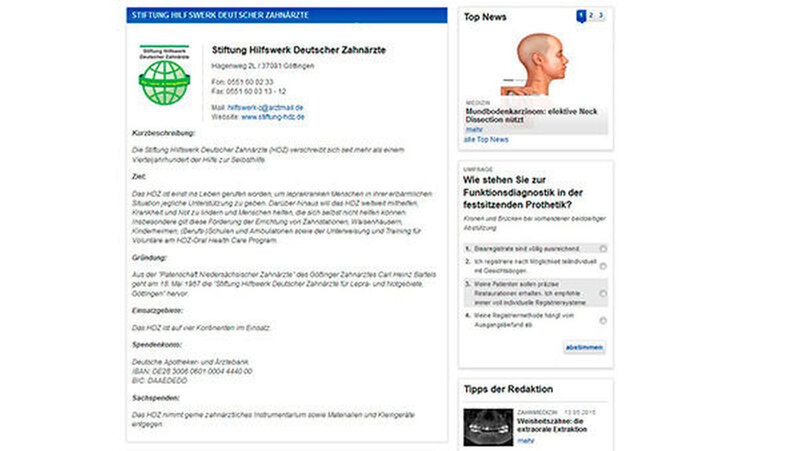 Ab sofort ist der Bereich "Soziales Engagement" auf unserer Homepage freigeschaltet - das heißt, bei uns werden alle Aktivitäten der zahnärztlichen Hilfswerke gebündelt und multimedial präsentiert. Der User kann für jede Organisation ihre Aktionsfelder in den jeweiligen Ländern finden. Ein weiterer Vorteil: Die Einrichtungen stellen sich selbst im Detail vor - mit Kontaktdaten, einer Kurzbeschreibung sowie einer Projektübersicht. So soll der Austausch zwischen den Hilfswerken weiter gefördert werden.