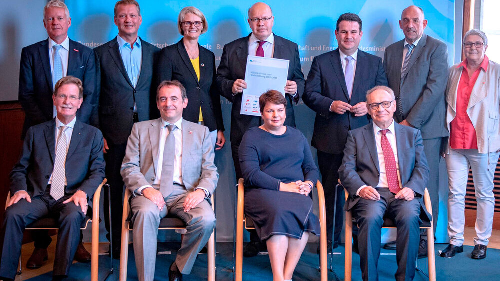 Vertreter der Bundesregierung, der Bundesagentur für Arbeit, der Wirtschaftsverbände BDA, BFB, DIHK und ZDH, von Gewerkschaften und Ländern haben im Bundesministerium für Wirtschaft und Energie eine neue Vereinbarung der Allianz für Aus- und Weiterbildung für die Jahre 2019 bis 2021 unterzeichnet. Mit der Erklärung wollen sich die Unterzeichner zu einer starken beruflichen Bildung bekennen und ihre Handlungsfelder und konkrete Maßnahmen dafür neu ausrichten. Das Bündnis wurde Ende 2014 gegründet.