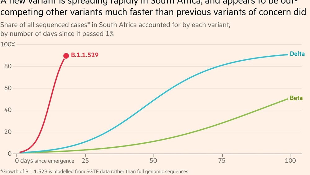 Das exponentielle Wachstum, das die Grafik der South African National Health Laboratory Service (NHLS) als roten Vektoren zeigt, gibt Anlass zu Sorge. Ihr liegen erste verfügbare Daten zugrunde, die belegen, dass die neu entdeckte Variante B.1.1.529 (Omikron) noch deutlich ansteckender ist als die sogenannte Beta und Delta Varianten. Bereits in der Nacht reagierten erste Staaten, darunter Großbritannien, mit der Einschränkung des Flugverkehrs aus Südafrika und einigen Nachbarstaaten. Die deutsche Regierung folgte am Morgen. Die Weltgesundheitsorganisation (WHO) berät aktuell zu der Lage.