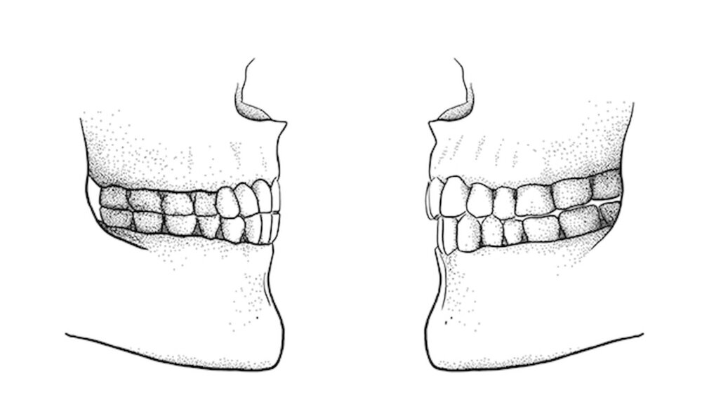 Aufgrund der härteren und zäheren Nahrung entwickelten frühere Menschen im Erwachsenenalter einen sogenannten Kopfbiss, bei dem die Schneidezähne des Ober- und Unterkiefers Kante auf Kante stoßen.