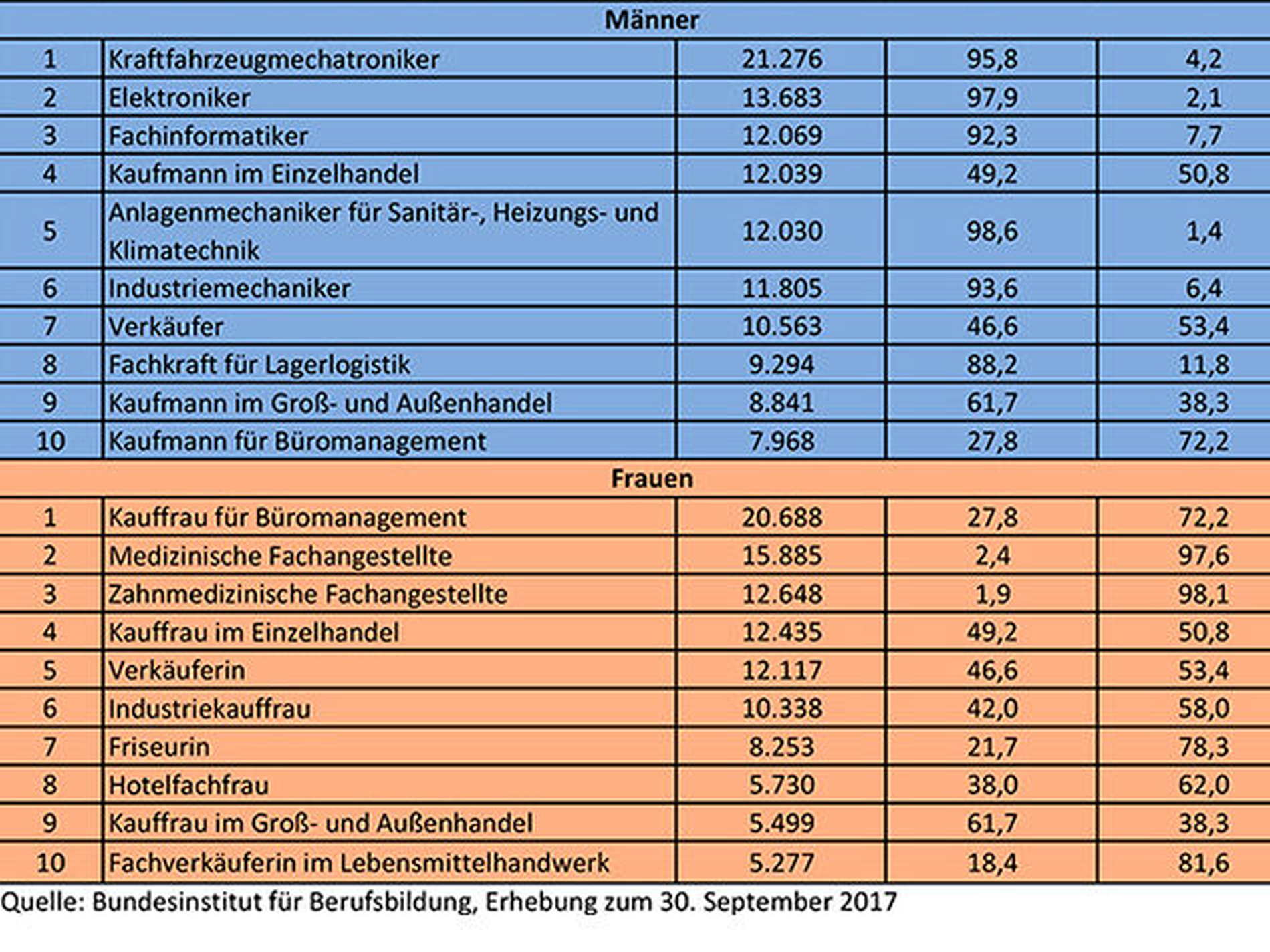 Das Ranking zeigt, dass bei vielen Ausbildungsberufen weiterhin eine sehr deutliche Geschlechterdominanz vorherrscht. So zählen bei Männern weiterhin Kraftfahrzeugmechatroniker, Elektroniker und Fachinformatiker zu den Berufen mit den meisten neu abgeschlossenen Ausbildungsverträgen. Die Frauen schlossen die meisten Ausbildungsverträge zur Kauffrau für Büromanagement ab - Medizinische Fachangestellte landeten auf Rang 2, ZFA auf Rang 3.