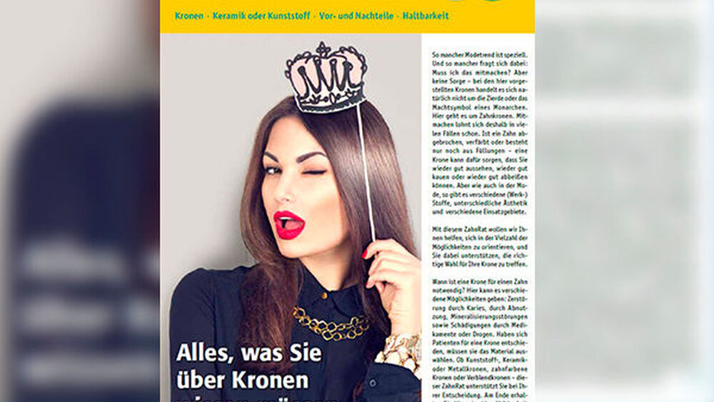"Eine Krone ist eine Art Schutzkappe für einen stark geschädigten Zahn. Mit einer Krone erhält er seine ursprüngliche Form wieder. Das Material entscheidet über das Aussehen der Krone: Ob Keramik-, Zirkonoxid- oder Metallkrone – der Patient hat die Wahl", heißt es in der aktuellen Ausgabe des ZahnRat.Die Zeitschrift soll Patienten dabei helfen, sich bei der Vielzahl der Möglichkeiten zu orientieren und die richtige Wahl bei einer Krone zu treffen.