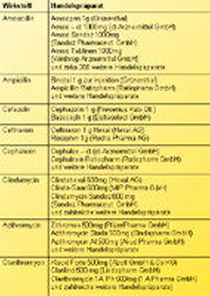 Die in den letzten Jahren in der klinischen Infektiologie wissenschaftlich erarbeiteten und belegten Grundprinzipien einer prophylaktischen Antibiotikagabe sind jetzt auch deutlich erkennbar für die Endokarditisprophylaxe gültig: Grundsätzlich handelt es sich immer um einmalige Antibiotikagaben („one shot“), die eine halbe bis eine Stunde vor dem möglicherweise Bakterien streuenden Eingriff verabreicht werden sollen. Dosiswiederholungen sind nicht vorgesehen. Es soll nicht jedes denkbar mögliche Erregerspektrum abgetötet werden, sondern nur die am wahrscheinlichsten zu erwartenden pathogenen Bakterien an Adhäsion und Invasion gehindert werden. Für die potentielle orale Bakteriämie beschränkt sich die antimikrobielle Zielsetzung auf die für die Endokarditisentstehung relevanten oralen „Viridans-Streptokokken“. Neben der unverändert beibehaltenen vorrangigen Empfehlung für die perorale Gabe von Amoxicillin werden jetzt weitere Wirkstoffe zur Verwendung in besonderen Situationen vorgeschlagen (Tabelle 4). Neben Aminopenicillinen (Ampicillin, Amoxicillin) werden verschiedene Cephalosporine (Cefazolin, Ceftriaxon, Cefalexin), Makrolide (Azithromycin, Clarithromycin) und das Lincosamid Clindamycin zur Anwendung vorgeschlagen. Dabei werden in der abwägenden Diskussion globale Aspekte der Resistenzentwicklung ebenso einbezogen wie das Bemühen um wirtschaftliche Verordnungsweise und vertretbare Anwendungsrisiken bei bekannter oder vermuteter Allergie auf Penicilline und Aminopenicilline. Handelspräparate der vorgeschlagenen Wirkstoffe in Deutschland sind beispielhaft in Tabelle 5 aufgeführt.