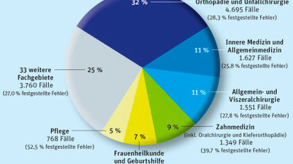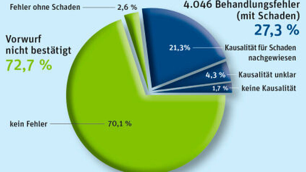 Die Zahl der gutachterlich festgestellten Fehler ist im Vergleich zum Jahr 2014 erneut leicht angestiegen. 2015 gingen die Gutachter in 14.828 Fällen einem Behandlungsfehlervorwurf nach - im Vorjahr waren es noch 14.663 Fälle. Dabei ging es um medizinische und zahnmedizinische Behandlungen sowie um Kranken- und Altenpflege. Die Frage: „Liegt ein Behandlungsfehler vor und hat der Patient einen Schaden erlitten?“ bejahten die ärztlichen Gutachter des Medizinischen Dienst der Krankenversicherung (MDK) in mehr als jedem vierten Gutachten (27,3 Prozent) - also in 4.064 Fällen.