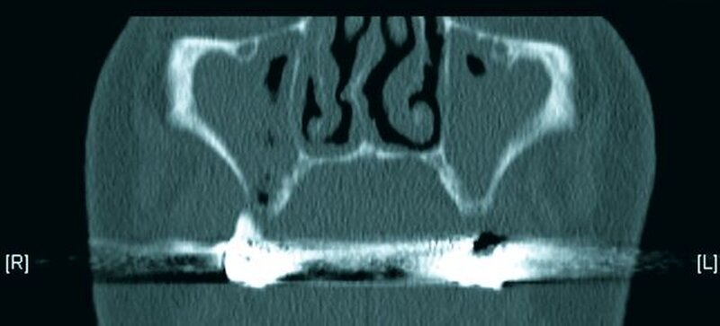 Die Computertomografie der Nasennebenhöhlen (NNH-CT) (nativ) zeigte dann das Ausmaß der knöchernen Destruktion. Neben der ausgedehnten generalisierten Nekrose des Oberkiefers konnte nebenbefundlich eine zystische Läsion im Bereich des Unterkiefers Regio 41 bis 45 diagnostiziert werden. Voraussichtlich ging diese vom Wurzelrest des Zahnes 41 aus. Weiterhin bestand eine totale Verschattung beider Sinus maxillaris und eine akzentuierte Lymphadenopathie in allen abgebildeten Leveln.