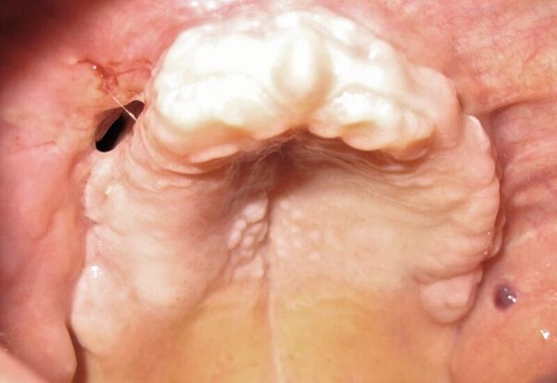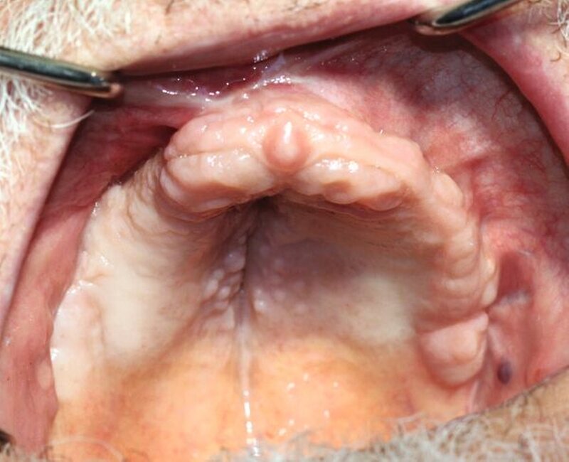 Eine histopathologische Aufarbeitung des eingesandten Knochenmaterials bestätigte die Knochennekrose. Nach einer Heilungsphase von insgesamt drei Monaten konnte eine prothetische Versorgung mit einer Totalprothese in Ober- und Unterkiefer durch den Hauszahnarzt erfolgen. Der Patient wurde instruiert, bei auftretenden Druckstellen sofort den behandelnden Zahnarzt aufzusuchen, da diese als potenziell typische lokale Auslösefaktoren einer BPONJ (Bisphosphonate-induced osteonecrosis of the jaw) anzusehen sind [Dannemann C., 2007]. Alternativ zur tegumental getragenen Prothese hätte man eine Implantatgestützte Lösung zur Verringerung von Prothesenfreiheitsgrad in Betracht ziehen können. In einem systematischen Review von Grötz et al. [Grötz et al., 2010] wird die Möglichkeit einer Implantation bei Bisphosphonat-Patienten ausführlich diskutiert. Im vorliegenden Fall würde das Problem neben anderen Risikofaktoren auch rein anatomisch im fehlenden Alveolarfortsatz des ersten Quadranten vorliegen.