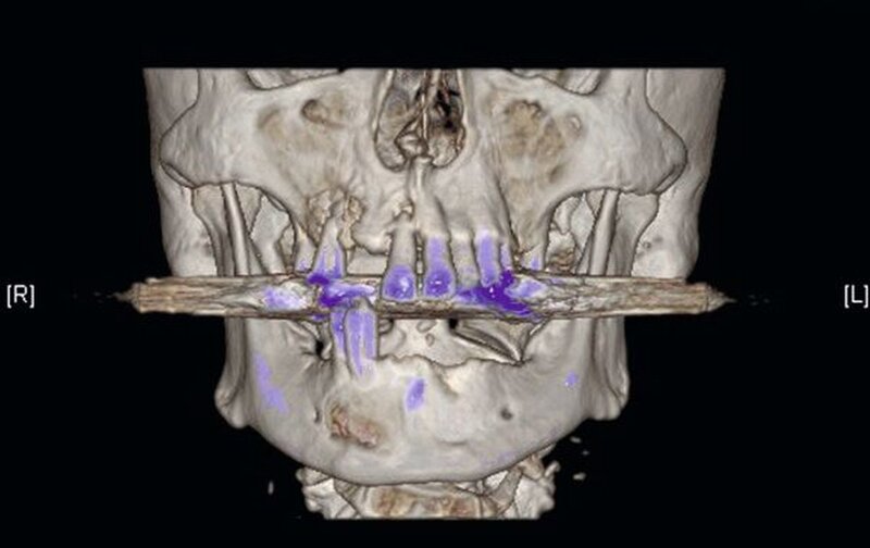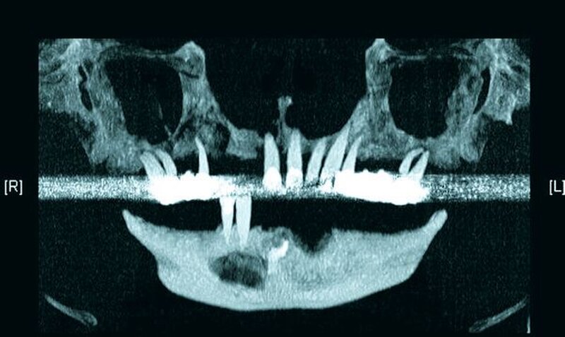 Bei der klinischen Inspektion imponierte ein desolates Gebiss bei starkem Knochenabbau und großflächigem Nekroseareal vestibulär im ersten Quadranten. Die Restbezahnung bestand aus den Zähnen 17, 15, 11 bis 24, 27 sowie 43 und 44. Alle Zähne wiesen Lockerungsgrad III auf. Neben einer spontanen Zahnfleischblutung konnte an mehreren Stellen eine putride Sekretion aus dem Parodontalspalt beobachtet werden. Des Weiteren wies der Patient einen enorm fauligen Foetor ex ore auf.