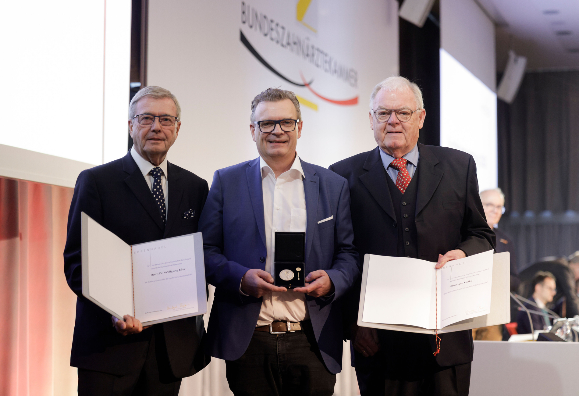 Zum Auftakt der Versammlung wurden der langjährige ehemalige Vorsitzende des Vorstands der KZBV, Dr. Wolfgang Eßer, und Lutz Müller, langjähriger Vorsitzender des Bundesverbandes Dentalhandel (BVD), mit der Goldenen Ehrennadel der BZÄK geehrt. „Unter der Ägide von Wolfgang Eßer wurden wesentliche und wichtige Verbesserungen in der vertragszahnärztlichen Versorgung gesetzlich verankert, auch in Zusammenarbeit mit der BZÄK und der Wissenschaft“, sagte BZÄK-Präsident Benz in seiner Laudatio. Dazu gehörten etwa Eßers Verdienste um das Versorgungskonzept der Zahnärzteschaft für Pflegebedürftige und Menschen mit Behinderung, das Konzept zu Early Childhood Caries (ECC) und die Verankerung der PAR-Behandlungsstrecke in der GKV. „Alles, was wir erreichen konnten, haben wir auf Initiative der Zahnärzteschaft erreicht“, kommentierte Eßer in seiner Dankesrede. Und: „Wir alle müssen unsere Komfortzone verlassen und der Politik klare Kante zeigen: Es reicht!“