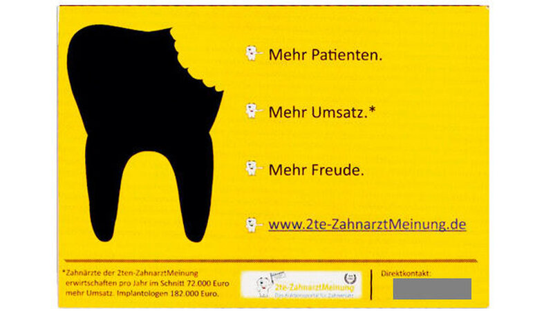 Ob er überhaupt „Notwendiges“ und/oder „Vergleichbares“ liefern kann, kann er gar nicht wissen. Denn das ist ohne eigene Befundung gar nicht zu beurteilen. Gern zitiere ich den Werbeflyer Ihres Auktionsportals 2te-Zahnarzt‧Meinung.de: „Mehr Patienten! Mehr Umsatz! Mehr Freude! Zahnärzte der 2ten-ZahnarztMeinung erwirtschaften pro Jahr im Schnitt 72.000 Euro mehr Umsatz.“