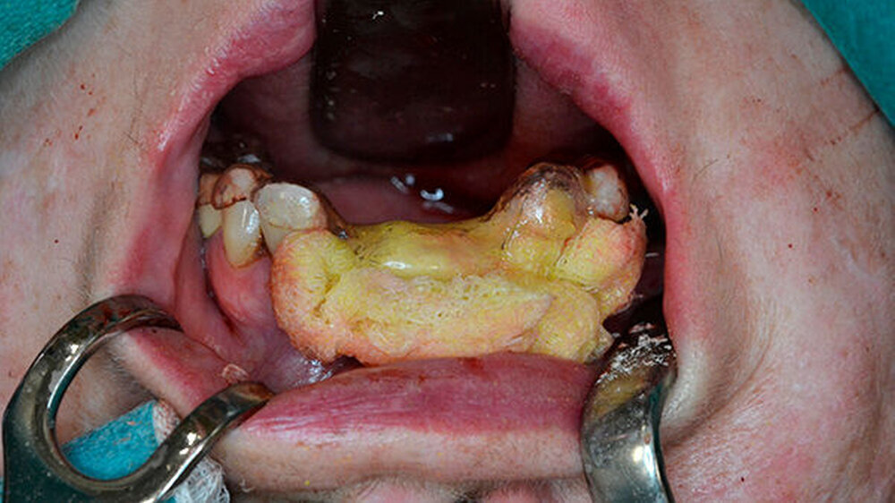 Nach erfolgter Tetrazyklinmarkierung mittels Doxycyclin 100 mg 1-0-0 für fünf Tage und präoperativer Abdrucknahme für eine Oberkieferverbandsplatte wurde der Eingriff in Intubationsnarkose durchgeführt. Nach marginaler Schnittführung wurden die Zähne 21, 12 und 13 entfernt sowie eine aufwendige modellierende Osteotomie im Sinne einer partiellen Resektion des Alveolarfortsatzes unter Schwartzlichtkontrolle in diesem Bereich durchgeführt (Abbildung 4).
