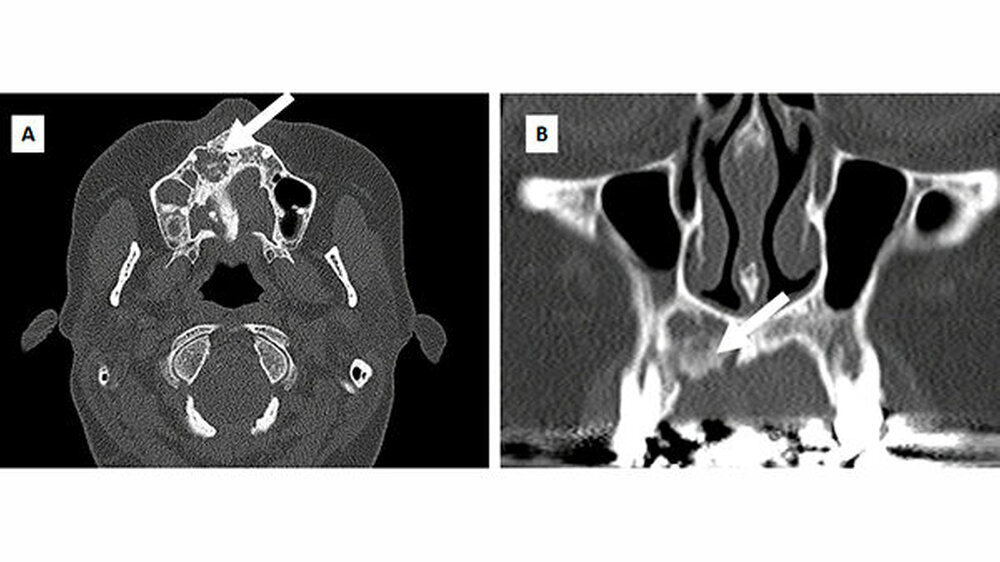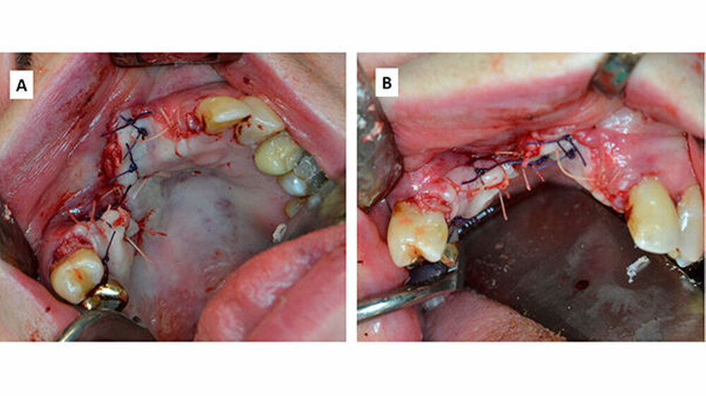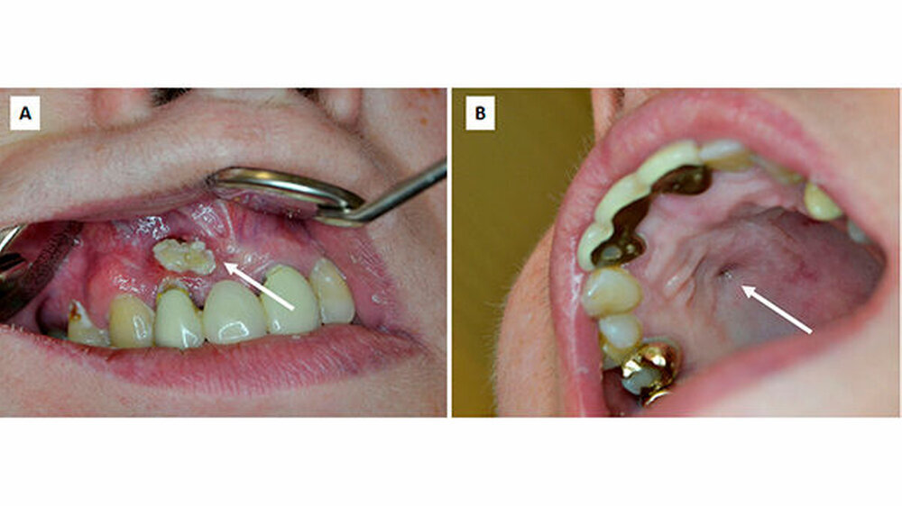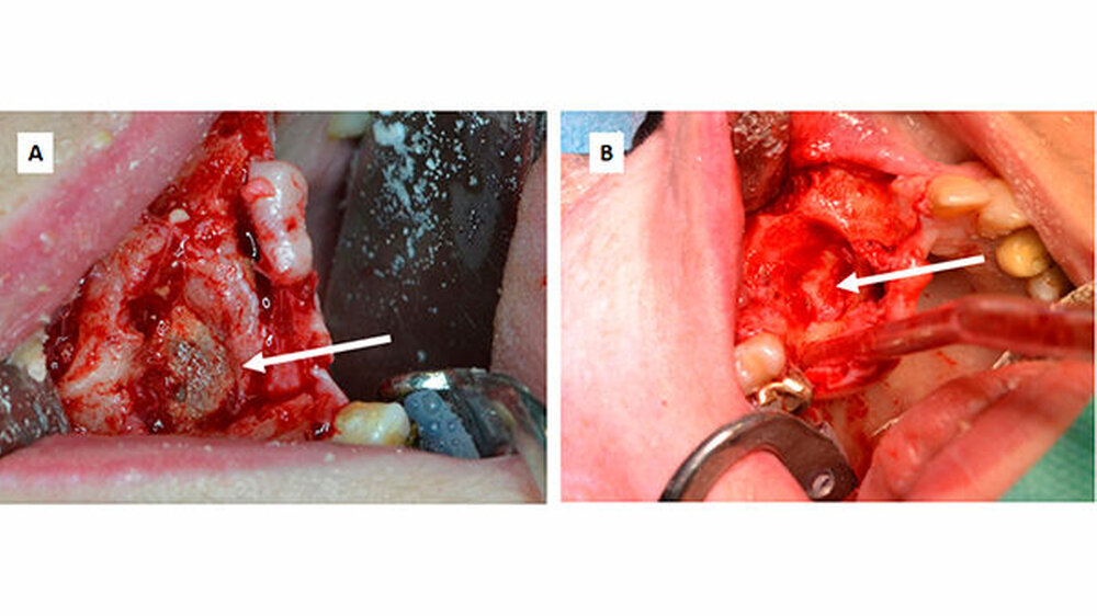 Es zeigte sich freiliegender Knochen (Os librum) im Bereich des Oberkiefervestibulums Regio 11/12 mit einer Flächenausdehnung von 2 cm auf 1 cm (Abbildung 1a). Korrespondierend dazu fand sich bei der weiteren intraoralen Inspektion eine palatinale Fistel (Abbildung 1b). Bei der Patientin waren bisher weder chirurgische Eingriffe noch Bestrahlungen im Kopf-Hals-Bereich erfolgt.