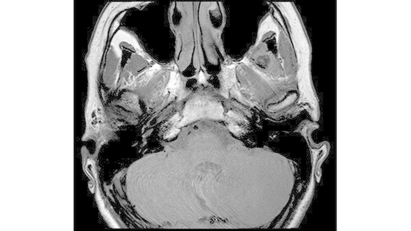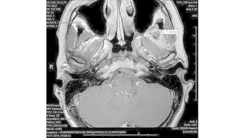Das neun Tage später durchgeführte MRT zeigte keinen Anhalt für eine Läsion des Diskuskomplexes beidseits. Es wurde jedoch eine umschriebene, teils T2-hyperintense sowie kräftig randständig kontrastmittelaufnehmende Läsion im M. pterygoideus medialis links (axial bis zirka 1,0 cm) angrenzend an den Processus muscularis vereinbar mit einem kleinen intramuskulären Abszess beschrieben (Abbildungen 3 a und b).