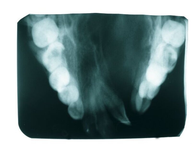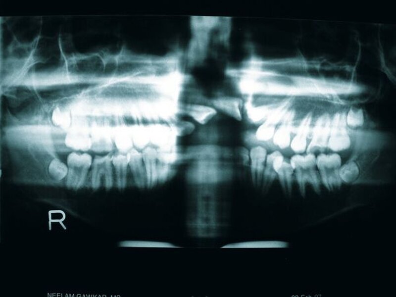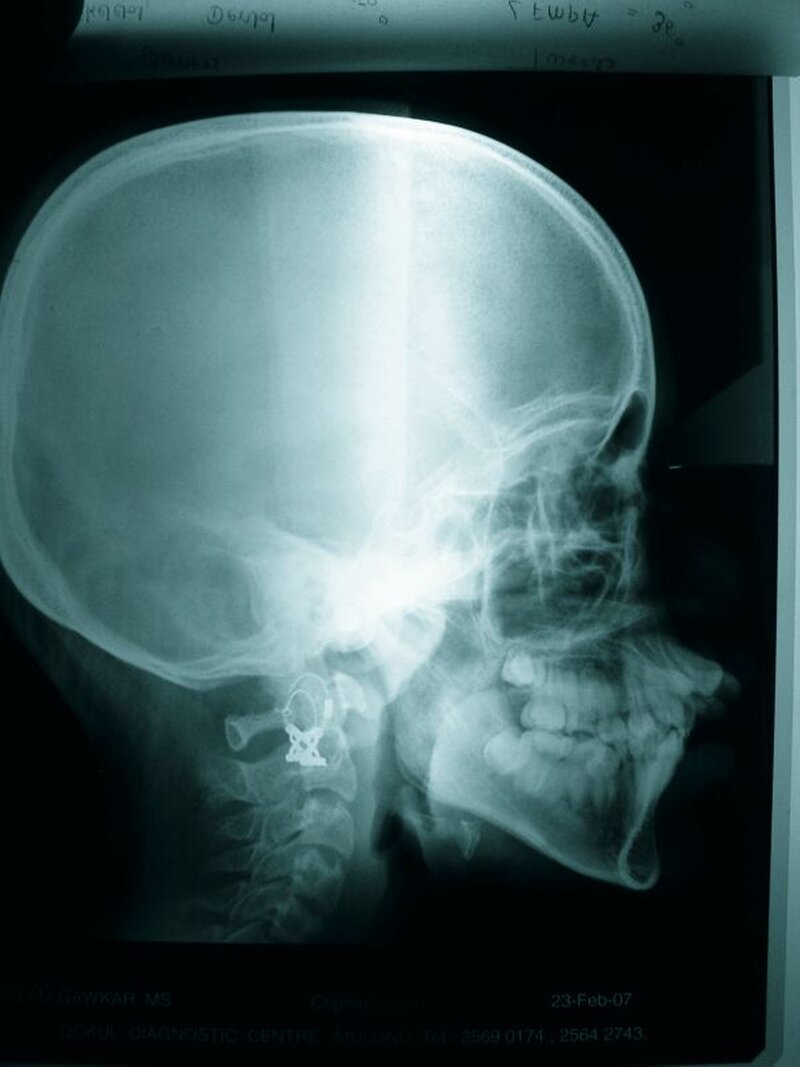 Die radiologische Untersuchung bestand aus einem Orthopantomogramm (OPTG), einer Aufbissaufnahme sowie einer Fernröntgenseitaufnahme (FRS). Neben der Übersicht der Gebissituation mit Nachweis des nicht durchgebrochenen Zahnes 22 im OPTG (Abbildung 3) war in der Aufbissaufnahme der Umfang der knöchernen Gaumenspalte klar zu erkennen (Abbildung 4). Das FRS ließ – bis auf die vertikal anterior verkürzte Maxilla und eine Protrusion der anterioren Prämaxilla – einen weitgehend normalen knöchernen Befund diagnostizieren (Abbildung 5).
