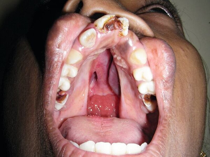 Das linke Nasenloch war um die Spalte herum erweitert, die Nase selbst durch eine Verschiebung in die kontralaterale Gesichtshälfte deformiert. Es bestand eine Protrusion der Zähne 12, 11 und 13 nach vestibulär durch die Spalte. Enoral imponierte weiterhin eine offene Gaumenspalte (Abbildung 2). Die Molaren befanden sich in Klasse-I-Okklusion nach Angle, ein interdentales Spacing konnte zwischen den Zähnen 13 bis 24 befundet werden; 11 und 21 waren rotiert, 22 nicht zu sehen. Im anterioren Bereich des rechten Oberkiefers hatte sich ein skelettal offener Biss entwickelt. Während des Sprechens oder Schluckens kam es zu einem Vorstrecken der Zunge.