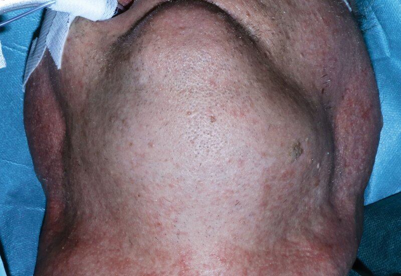 Bei der Vorstellung des Patienten imponierte klinisch eine derbe, nicht verschiebliche, mindestens 5,5 cm messende Raumforderung submental bis submandibulär mittig-links. Bei ausgeprägtem dentalem Sanierungsbedarf bestanden keine Perkussionsschmerzen. Der Mundboden war weich. Es zeigte sich klarer, suffizienter Speichelfluss. Schmerzen, Atem- oder Schluckbeschwerden wurden negiert, jedoch fiel eine kloßige Sprache auf.