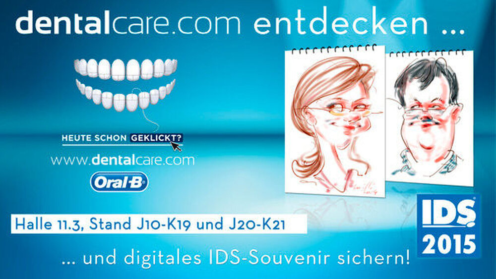 Die Online-Plattformhttp://www.dentalcare.com _blank external-link-new-windowbietet registrierten Mitgliedern somit eine Vielzahl von attraktiven Vorteilen, wodurch sie sich ganz klar als Startseite im Browser von „Dental Professionals“ qualifiziert. Warum es sich lohnt, die Website von Oral-B genauer kennenzulernen, erfahren Besucher der IDS 2015 in dem eigens für dentalcare.com eingerichteten Messebereich. Neben vielen nützlichen Informationen und konkreten Tipps erwartet die Messebesucher dort auch ein ganz besonderes Highlight: Wer sich am Stand für eine Registrierung entscheidet, erhält eine digitale Karikatur von sich selbst oder von seinem gesamten Team als Dankeschön. Diese kann dann später bequem per Login und individuellem Code online abgerufen werden. Eine ganz besondere Erinnerung an die IDS 2015 – ideal auch zum Posten und Sharen auf Facebook und Co. Der Besuch des dentalcare.com-Messebereichs und die Registrierung am Stand lohnen sich daher gleich doppelt. Denn den Besuchern bleibt so nicht nur ein schönes Souvenir, auch in Zukunft können sie von den Vorteilen des Online-Portals profitieren.