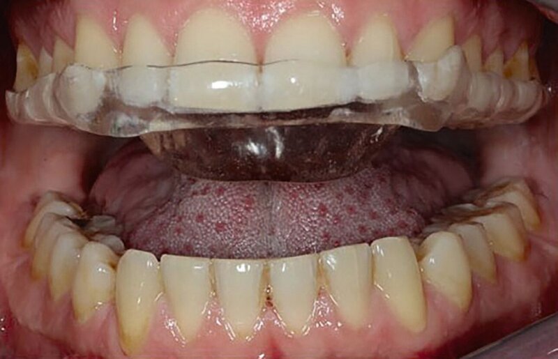 Als Therapiemittel können Relaxierungs- oder Repositionsschienen eingesetzt werden. Eine Sonderform stellt in diesem Kontext der Einsatz von Simulationsschienen dar (Abbildungen 9 bis 11). Diese sind aus zahnfarbenem Material anatomisch gefertigt und werden ganztags getragen [Güth et al., 2022]. Je nach Güte der Retention an den Zähnen können Betroffene hiermit auch essen.