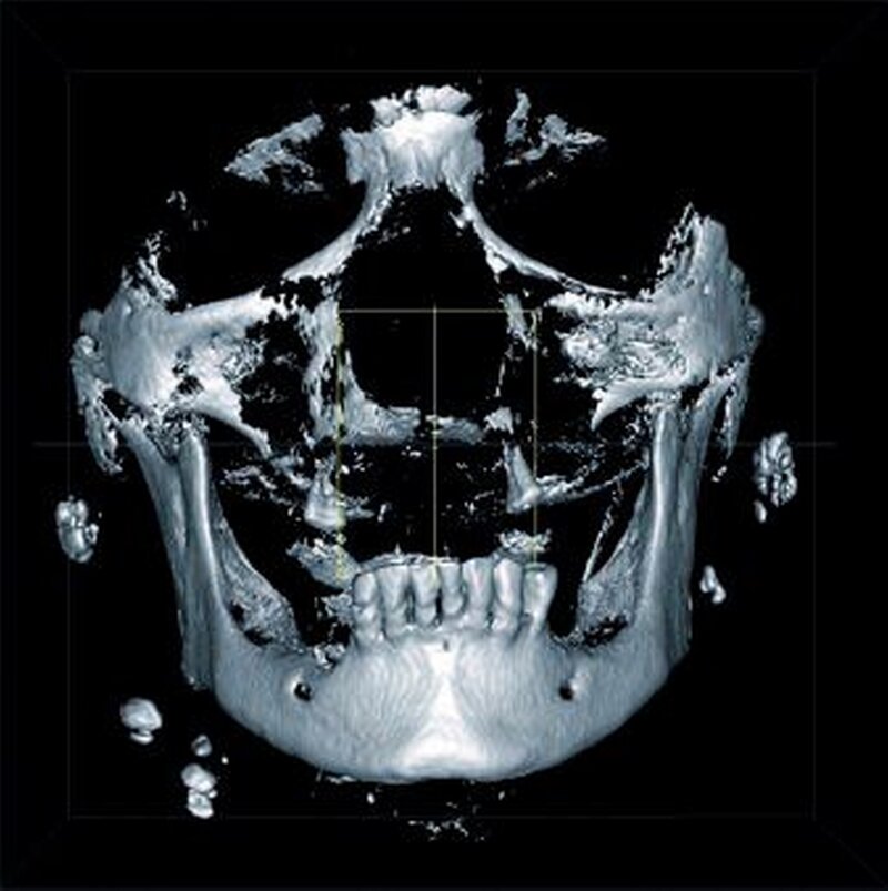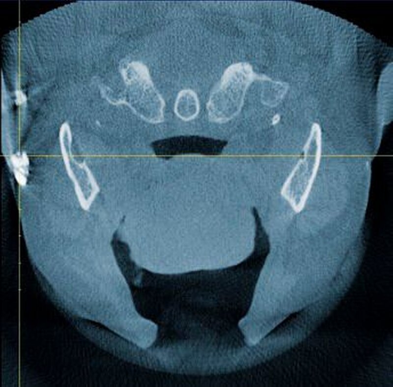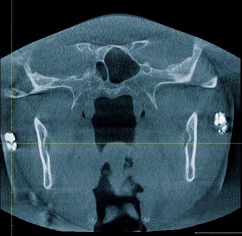 Zur genauen räumlichen Zuordnung der Verschattungen unterhalb der Incisurae semilunares wurde eine dentale digitale volumentomografische Untersuchung durchgeführt (Abbildungen 2 bis 4).