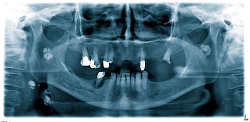 • Asymptomatische Ossifizierungen der Lymphknoten, des Pharynx, der Speicheldrüsen und des vaskulären Systems können sich in der Panoramaschichtaufnahme als Zufallsbefunde darstellen.