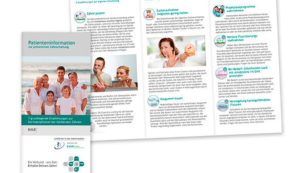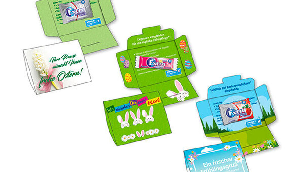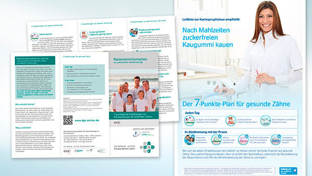 Zahnarzt- und Arztpraxen können ihren großen und kleinen Patienten zur Osterzeit nach der Behandlung eine kleines Lächeln ins Gesicht zaubern und gleichzeitig Lust auf Prophylaxe machen – mit Extra-Kaugummi im passend zum Osterfest und Frühlingsstart gestalteten Envelope (s. Abbildung 1). Mit den drei Leitlinien-Tipps zur täglichen Kariesprophylaxe auf der Innenseite – Zähne putzen, wenig Zucker, Kaugummi kauen – erinnern die Envelopes daran, beim Genuss auch an die Zähne zu denken. Zusätzlich dazu kann das Praxisteam den Patientinnen und Patienten mithilfe des Leitlinien-Patientenflyers alle 7 Empfehlungen der Leitlinie aufzeigen und die Broschüre anschließend mitgeben (s. Abbildung 2). So bleibt die Praxis in guter Erinnerung, Patienten kommen gerne wieder und empfehlen sie weiter.