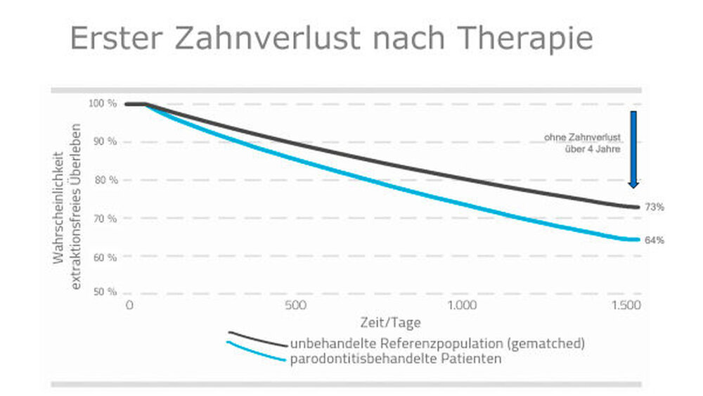 Demzufolge zeigen die Daten, dass auch nach abgeschlossener Parodontitistherapie die Häufigkeit von Zahnverlust erhöht bleibt. Bei etwa einem Drittel der Patienten geht mindestens ein Zahn innerhalb von vier Jahren verloren. Bei einer Vergleichsgruppe ohne Therapie war im gleichen Zeitraum nur etwa ein Viertel betroffen. "Die Ergebnisse mögen zunächst enttäuschen", sagt Walter. "Sie können aber nicht ursächlich auf Qualitätsdefizite in der Parodontitistherapie zurückgeführt werden." Vielmehr bleibe der Parodontitispatient auch nach Abschluss der Behandlung ein Risikopatient. "Daher sollte weiteren Zahnverlusten durch intensive Nachsorge entgegengewirkt werden", plädiert Walter.