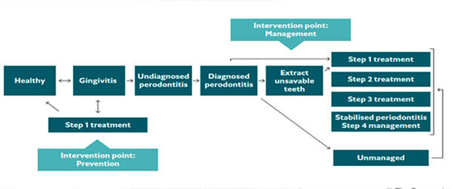 Die Wissenschaftler entwickelten ein Modell, um die wirtschaftliche Belastung durch Zahnfleischerkrankungen und die Kapitalrendite (Return on Investment - ROI) für die Behandlung von Parodontitis zu ermitteln. Um die Auswirkungen von Prävention und Behandlung zu messen, orientierte sich das Modell an den EFP-Behandlungsrichtlinien, die vier Behandlungsschritte einer Parodontitis beschreiben (Abbildung 1).