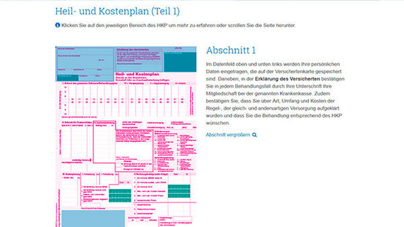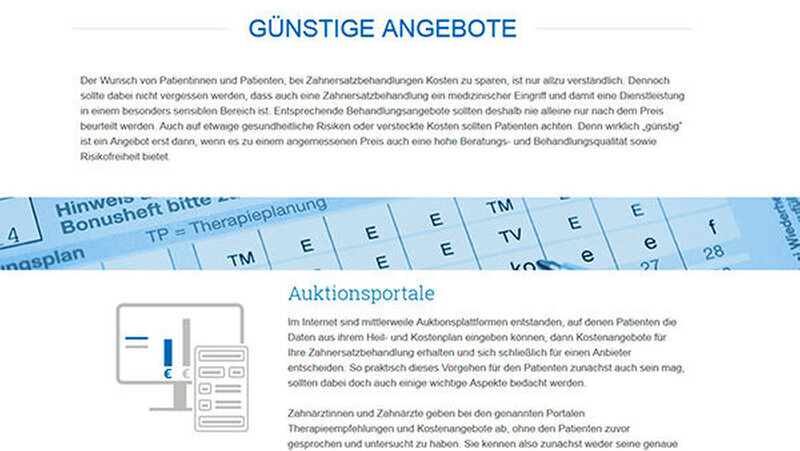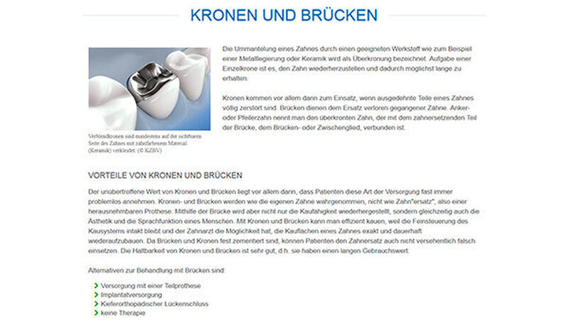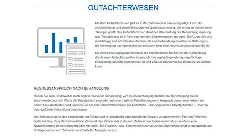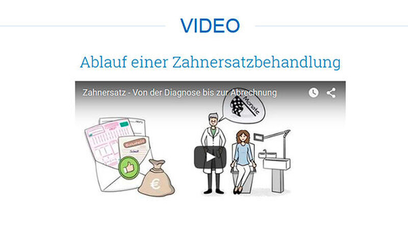 Per Erklär-Video werden Patienten durch alle Schritte des Behandlungsprozesses geleitet - von der Diagnose über die Behandlung bis hin zur Gewährleistung bei Problemen mit dem Zahnersatz im Anschluss an die Versorgung. Die Seite zeigt auch, wie Patienten, die vor einer Zahnersatzbehandlung eine zweite Meinung einholen möchten, die dafür vorgesehenen zahnärztlichen Beratungsinstanzen vor Ort in den jeweiligen Bundesländer finden.
