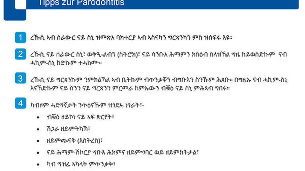 Die Informationsblätter zu den Themen „Gesunde Kinderzähne“, „Mundhygiene zuhause“, „Parodontitis“ und „Zähne und Allgemeingesundheit“ sind nun erhältlich in den Sprachen: Englisch, Arabisch, Türkisch und Tigrinya. Die Übersetzung erfolgte durch den Dolmetscherdienst des Ethnomedizinischen Zentrums Hannover.