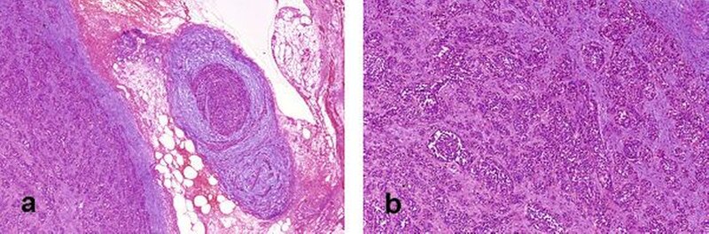 Der periphere primitive neuroektodermale Tumor (pPNET) ist ein seltener, hochmaligner Weichteiltumor neuroektodermalen Ursprungs und zählt damit zu den Sarkomen. Die breite Familie der primitiven neuroektodermalen Tumoren (PNET) wird in drei Gruppen unterteilt [Batsakis, Mackay et al., 1996; Nikitakis, Salama et al., 2003]. Die Tumoren der ersten Gruppe gehen vom zentralen (wie Medulloblastom), die der zweiten vom autonomen Nervensystem (zum Beispiel Neuroblastom) aus. Die dritte Gruppe beinhaltet periphere, also weder vom zentralen noch vom autonomen Nervensystem ausgehende neuroektodermale Tumore. Tumore der dritten Gruppe sind vergleichsweise selten. Der in diesem Fall vorliegende Tumor, der auch als peripheres Neuroepitheliom bezeichnet wird, gehört – wie auch das morphologisch sehr ähnliche Ewing-Sarkom – zur letztgenannten Gruppe. Obwohl eine eindeutige Verbindung zu einem peripheren Nerven für die Diagnose nicht gefordert wird, findet sich – wie auch im dargestellten Fall – in einem Drittel der Fälle eine enge Lagebeziehung zu einem größeren Nerv [Enzinger and Weiss, 1995]. Exakte Angaben zur perineuralen Tumorausbreitung finden sich in der Literatur nicht. Insgesamt findet sich ein solches Wachstum bei 2,5 bis 6 Prozent aller Malignome. Im Kopf-Hals-Bereich tritt dieses Verhalten vorwiegend bei adenoidzystischen Karzinomen auf, kann jedoch auch bei Karzinomen, Sarkomen und Melanomen beobachtet werden [Mendenhall, Amdur et al., 2007; Maroldi, Farina et al., 2008].